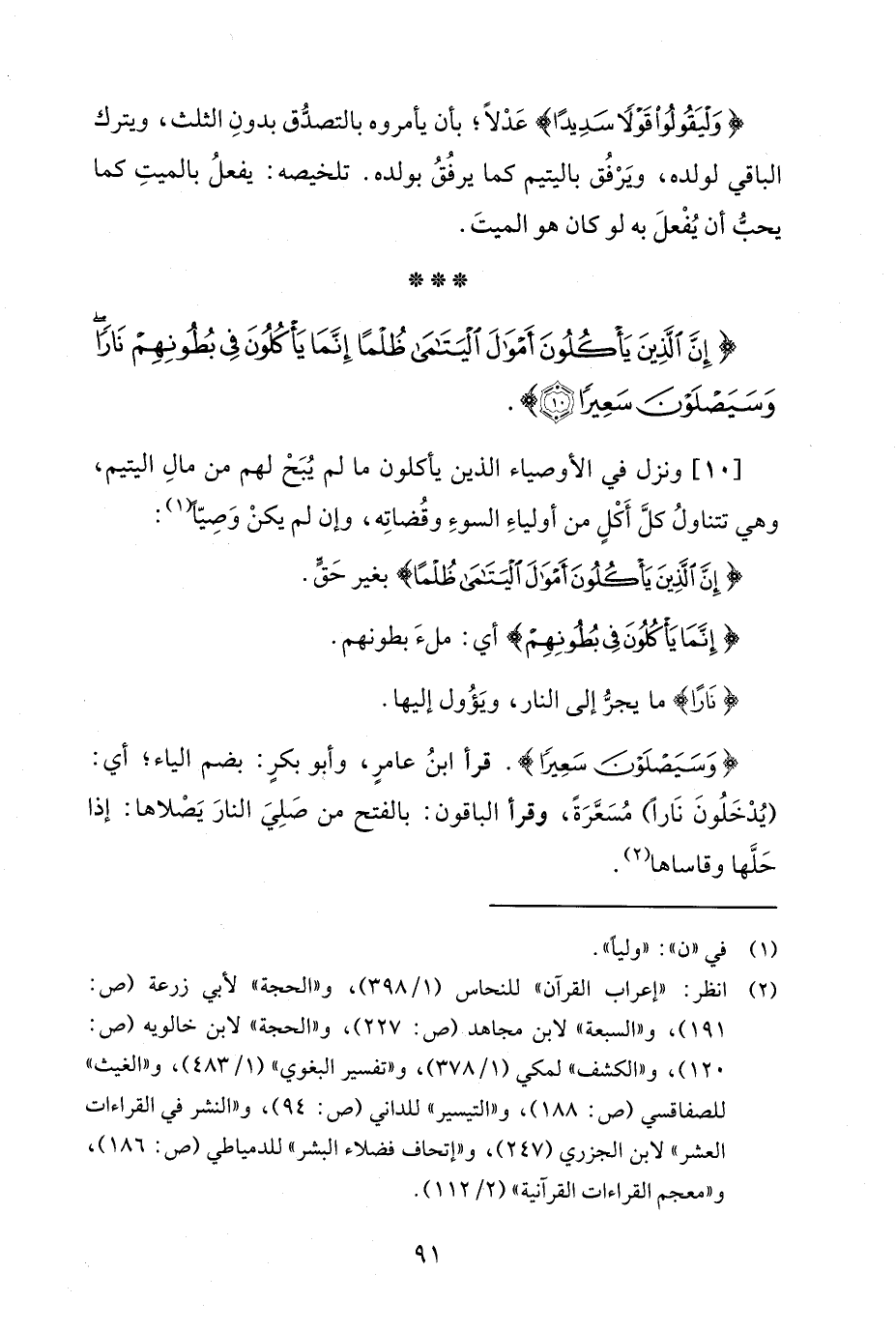 {إِنَّ الَّذِينَ يَأْكُلُونَ أَمْوَالَ الْيَتَامَى ظُلْمًا إِنَّمَا يَأْكُلُونَ فِي بُطُونِهِمْ نَارًا وَسَيَصْلَوْنَ سَعِيرًا (10)}.