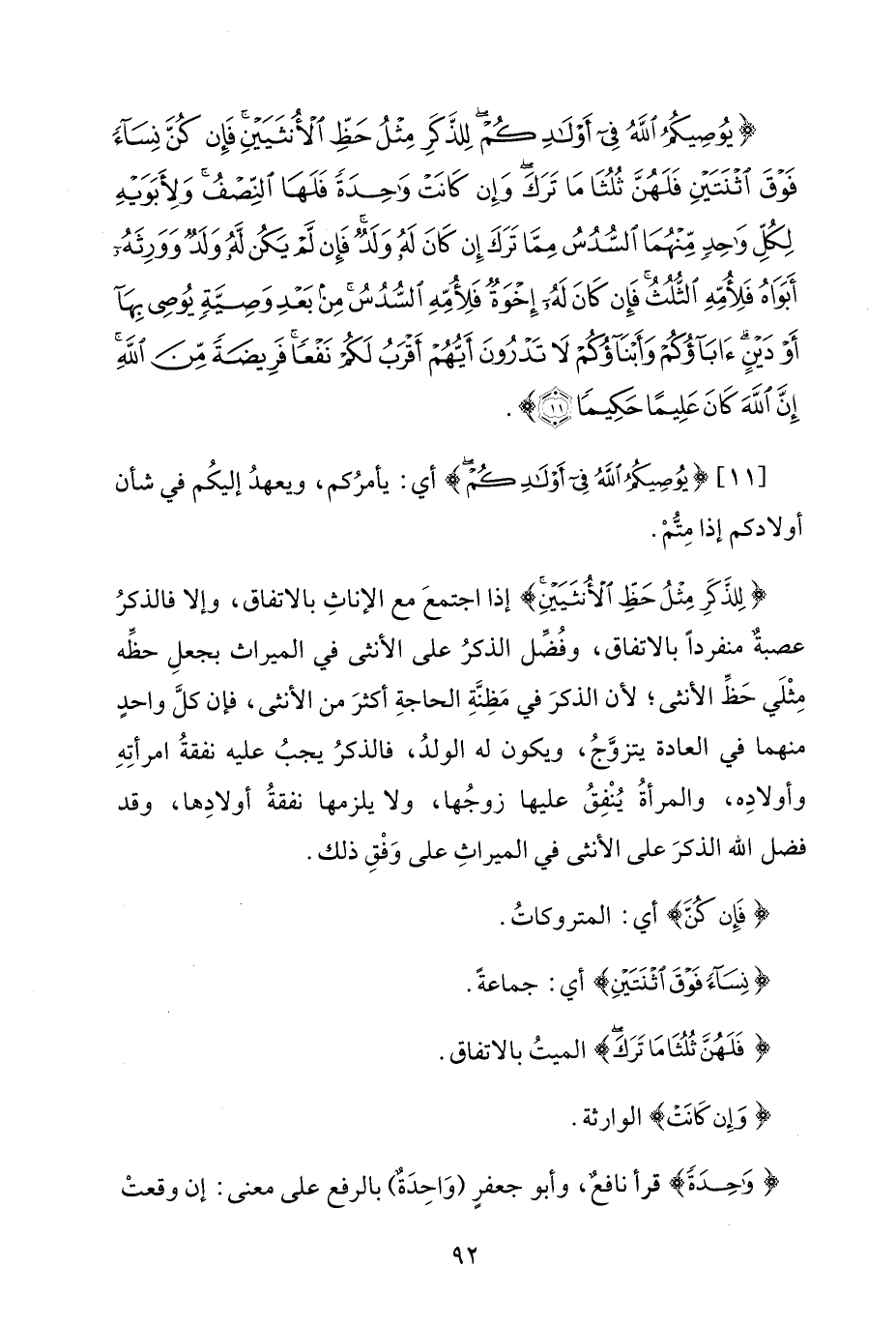 {لِلذَّكَرِ مِثْلُ حَظِّ الْأُنْثَيَيْنِ} إذا اجتمعَ مع الإناثِ بالاتفاق، وإلا فالذكرُ عصبةٌ منفردًا بالاتفاق، وفُضِّل الذكرُ على الأنثى في الميراث بجعلِ حظِّه مِثْلَي حَظِّ الأنثى؛ لأن الذكرَ في مَظِنَّةِ الحاجةِ أكثرَ من الأنثى، فإن كلَّ واحدٍ منهما في العادة يتزوَّجُ، ويكون له الولدُ، فالذكرُ يجبُ عليه نفقةُ امرأتِهِ وأولادِه، والمرأةُ يُنْفِقُ عليها زوجُها، ولا يلزمها نفقةُ أولادِها، وقد فضل الله الذكرَ على الأنثى في الميراثِ على وَفْقِ ذلك.