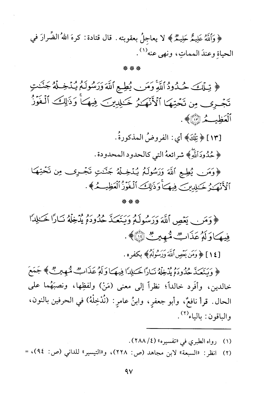 {تِلْكَ حُدُودُ اللَّهِ وَمَنْ يُطِعِ اللَّهَ وَرَسُولَهُ يُدْخِلْهُ جَنَّاتٍ تَجْرِي مِنْ تَحْتِهَا الْأَنْهَارُ خَالِدِينَ فِيهَا وَذَلِكَ الْفَوْزُ الْعَظِيمُ (13)}.