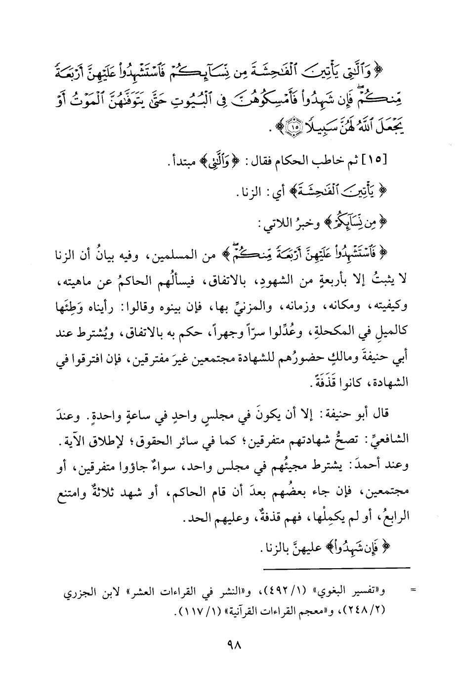 {فَاسْتَشْهِدُوا عَلَيْهِنَّ أَرْبَعَةً مِنْكُمْ} من المسلمين، وفيه بيانُ أن الزنا لا يثبتُ إلا بأربعةٍ من الشهودِ، بالاتفاق، فيسألُهم الحاكمُ عن ماهيته، وكيفيته، ومكانه، وزمانه، والمزنيِّ بها، فإن بينوه وقالوا: رأيناه وَطِئَها كالميلِ في المكحلةِ، وعُدِّلوا سرًّا وجهرًا، حكم به بالاتفاق، ويُشترط عند أبي حنيفةَ ومالكٍ حضورُهم للشهادة مجتمعين غيرَ مفترقين، فإن افترقوا في الشهادة، كانوا قَذَفَةً.