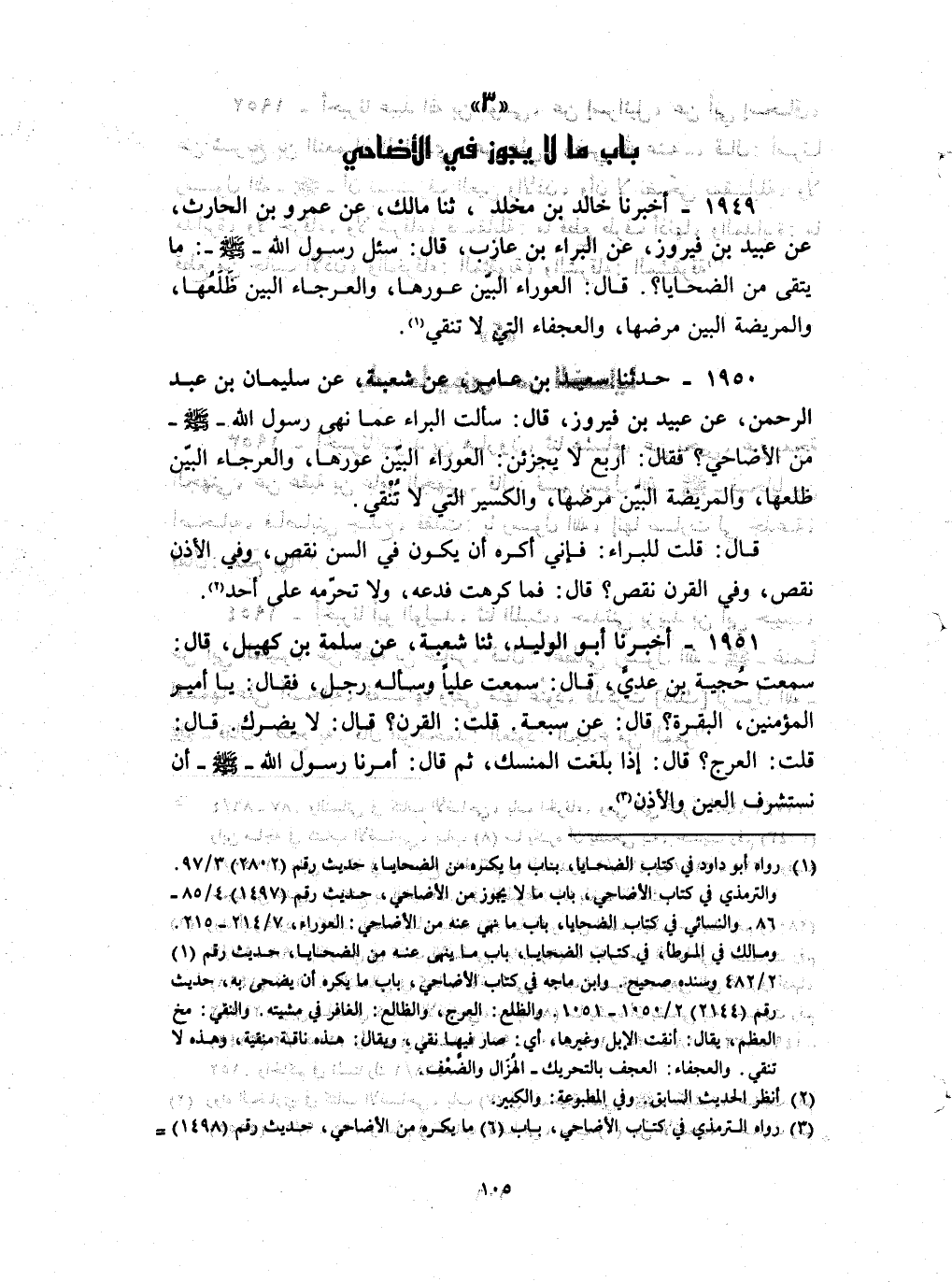 1949 - أخبرنا خالد بن مخلد ثنا مالك عن عمرو بن الحارث عن عبيد بن فيروز عن البراء بن عازب قال : سئل رسول الله صلى الله عليه و سلم ما يتقى من الضحايا قال العوراء البين عورها والعرجاء البين ظلعها والمريضة البين مرضها والعجفاء التي لا تنقى