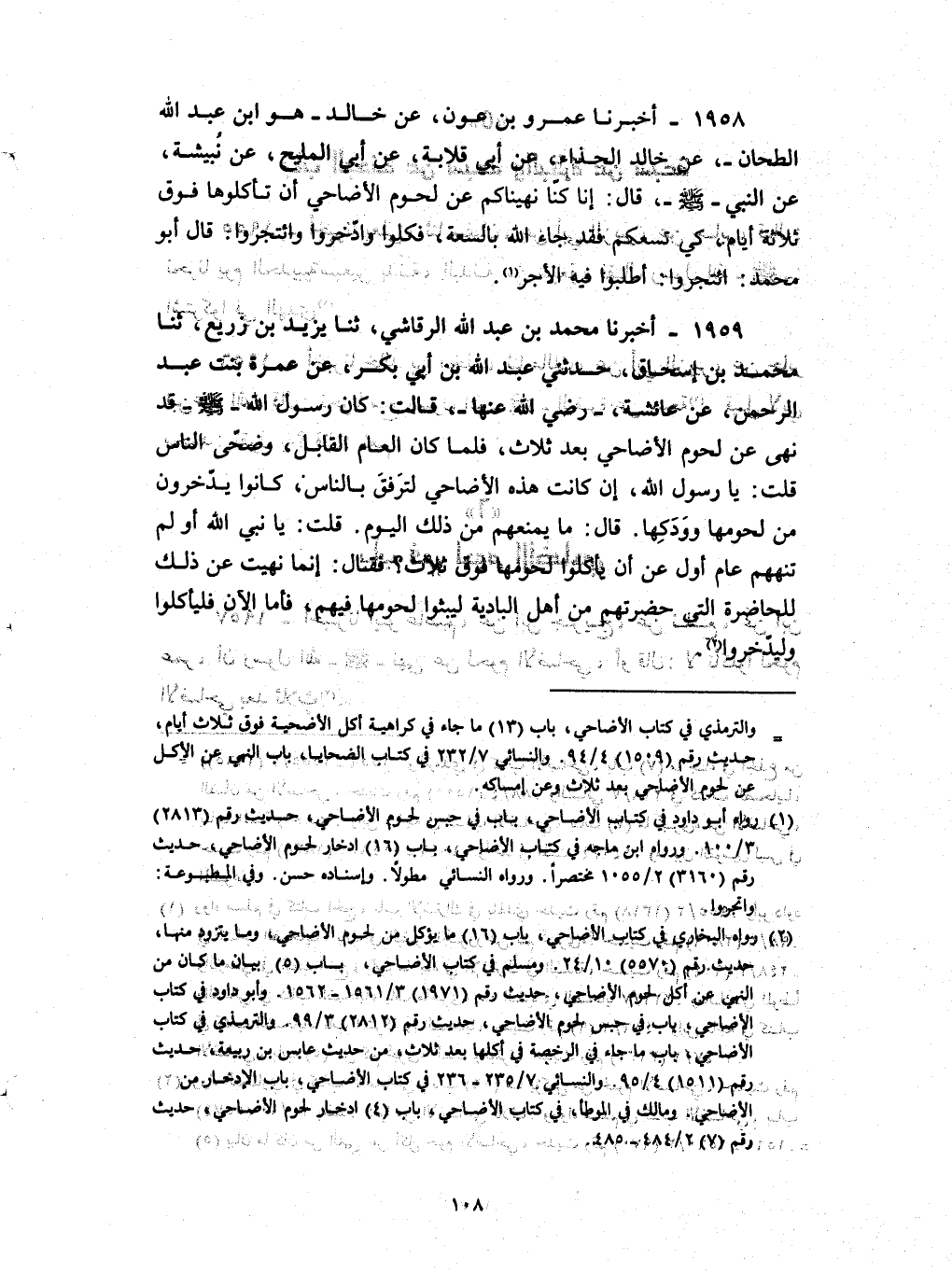 1958 - أخبرنا عمرو بن عون عن خالد هو بن عبد الله الطحان عن خالد الحذاء عن أبي قلابة عن أبي المليح عن نبيشة عن النبي صلى الله عليه و سلم قال : إنا كنا نهيناكم عن لحوم الأضاحي ان تأكلوها فوق ثلاثة أيام كي تسعكم فقد جاء الله بالسعة فكلوا وادخروا واتجروا قال أبو محمد اتجروا اطلبوا فيه الأجر