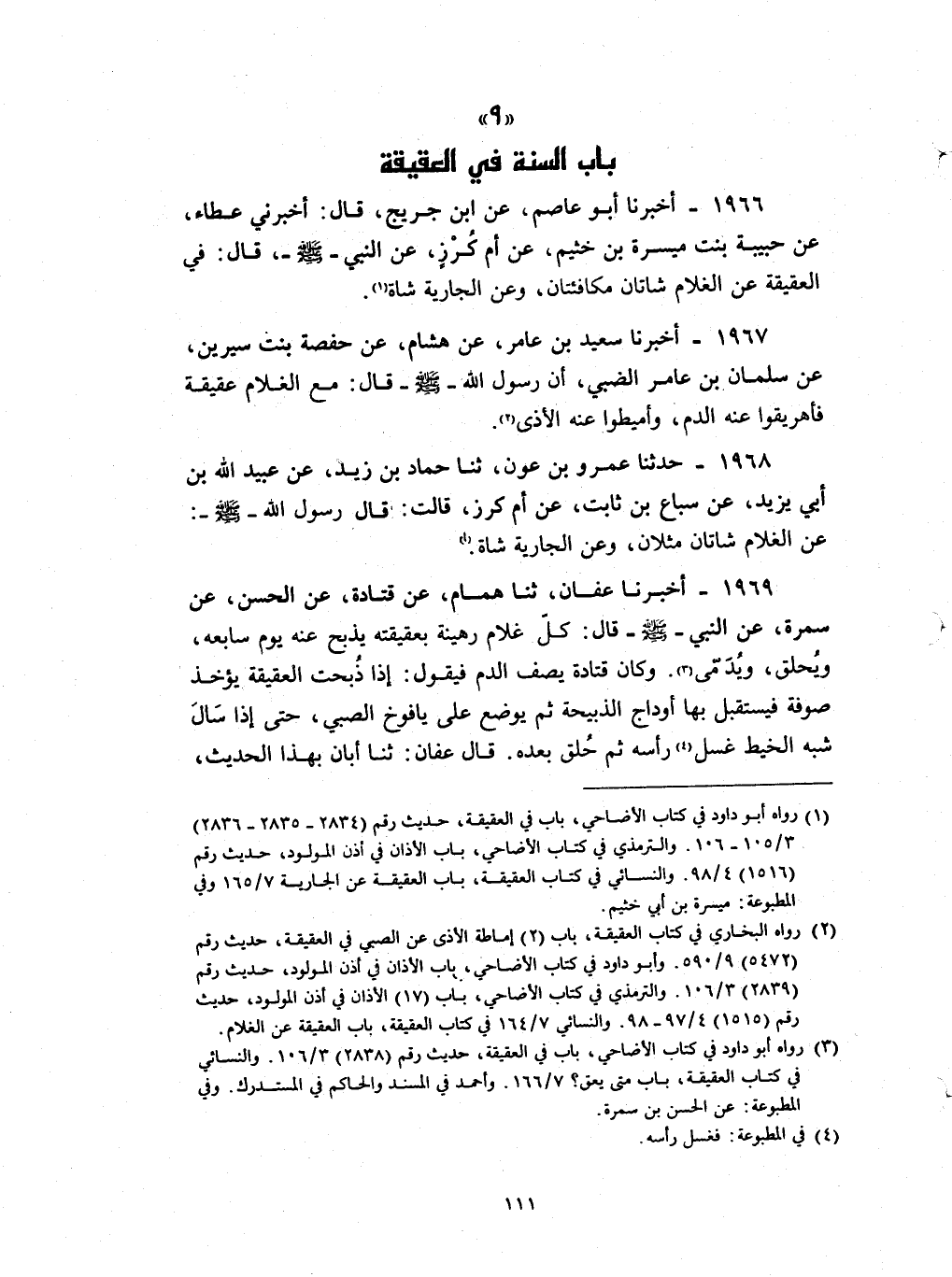 1967 - أخبرنا سعيد بن عامر عن هشام عن حفصة بنت سيرين عن سلمان بن عامر الضبي ان رسول الله صلى الله عليه و سلم قال : مع الغلام عقيقة فأهريقوا عنه الدم وأميطوا عنه الأذى