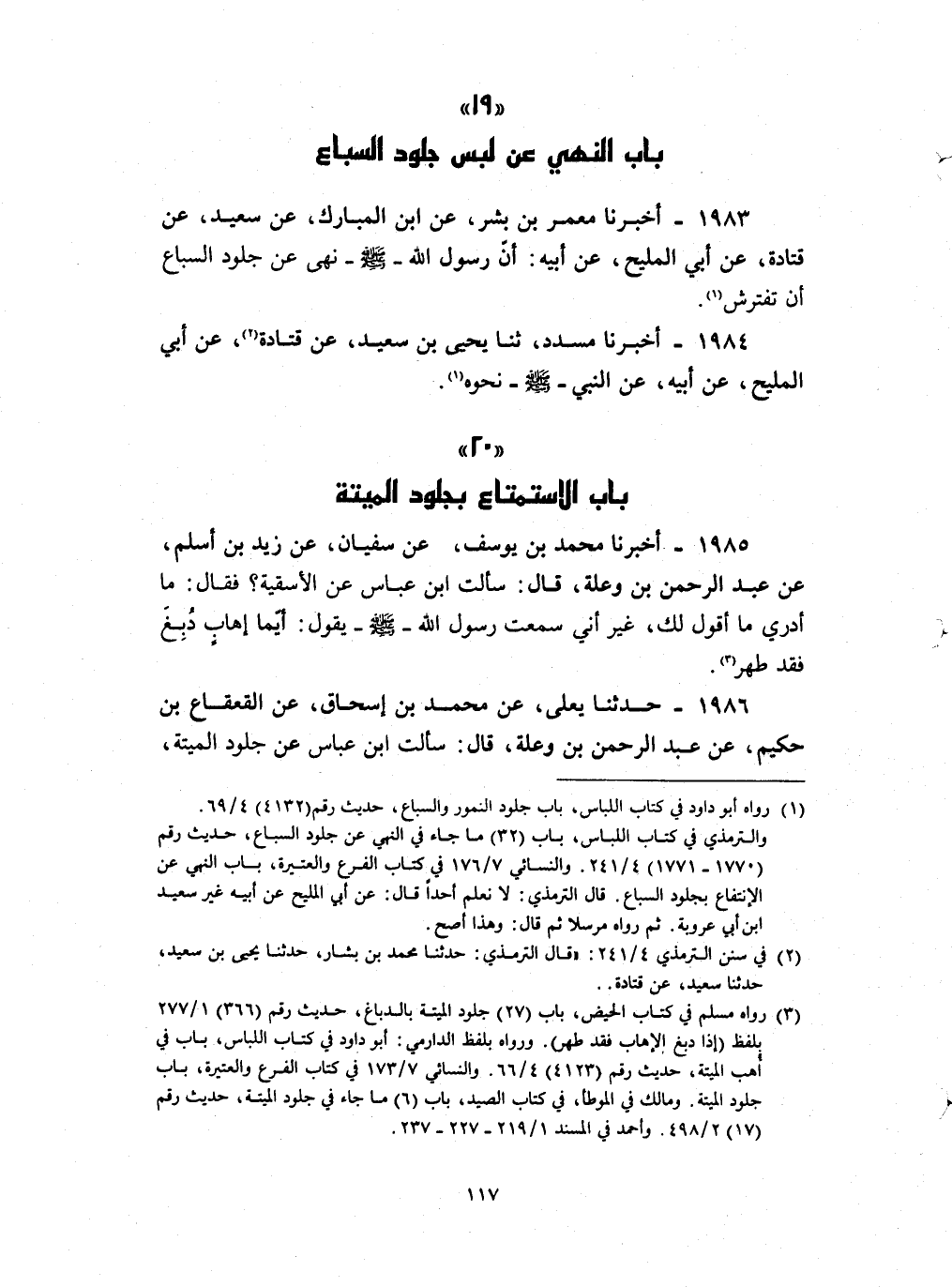 1983 - أخبرنا معمر بن بشر عن بن المبارك عن سعيد عن قتادة عن أبي المليح عن أبيه : ان رسول الله صلى الله عليه و سلم نهى عن جلود السباع ان تفترش