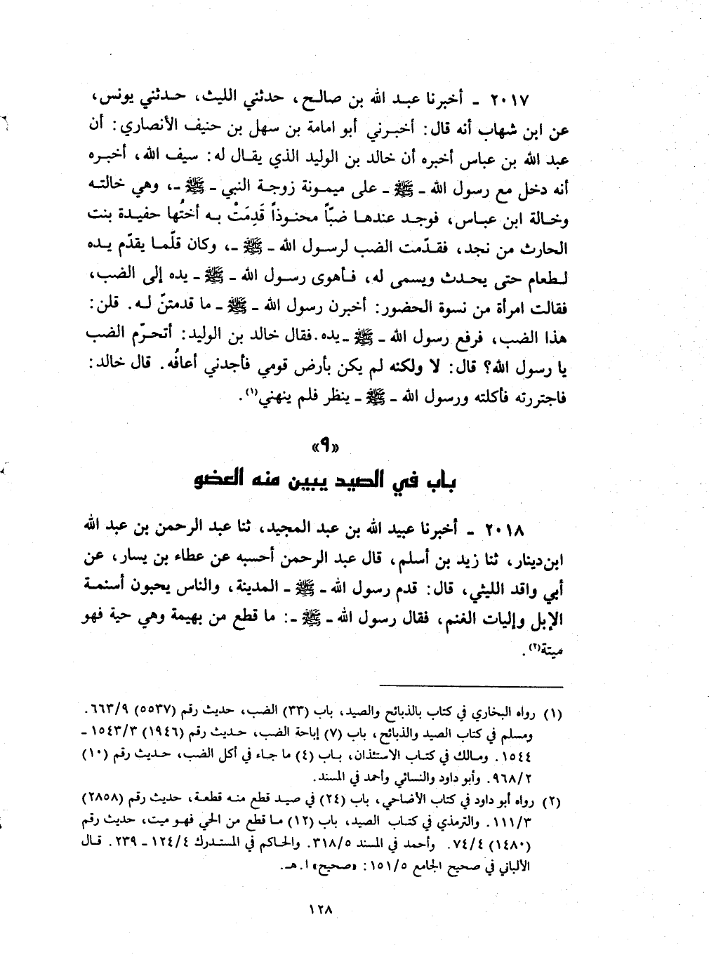 2017 - أخبرنا عبد الله بن صالح حدثني الليث حدثني يونس عن بن شهاب انه قال أخبرني أبو أمامة بن سهل بن حنيف الأنصاري ان عبد الله بن عباس أخبره ان خالد بن الوليد الذي يقال له سيف الله أخبره : انه دخل مع رسول الله صلى الله عليه و سلم على ميمونة زوجة النبي صلى الله عليه و سلم وهي خالته وخالة بن عباس فوجد عندها ضبا محنوذا قدمت به أختها حفيدة بنت الحارث من نجد فقدمت الضب لرسول الله صلى الله عليه و سلم وكان قلما يقدم يده لطعام حتى يحدث ويسمى له فأهوى رسول الله صلى الله عليه و سلم يده إلى الضب فقالت امرأة من نسوة الحضور أخبرن رسول الله صلى الله عليه و سلم ما قدمتن له قلن هذا الضب فرفع رسول الله صلى الله عليه و سلم يده فقال خالد بن الوليد أتحرم الضب يا رسول الله قال لا ولكنه لم يكن بأرض قومي فأجدني أعافه قال خالد فاجتررته فآكلته ورسول الله صلى الله عليه و سلم ينظر فلم ينهني