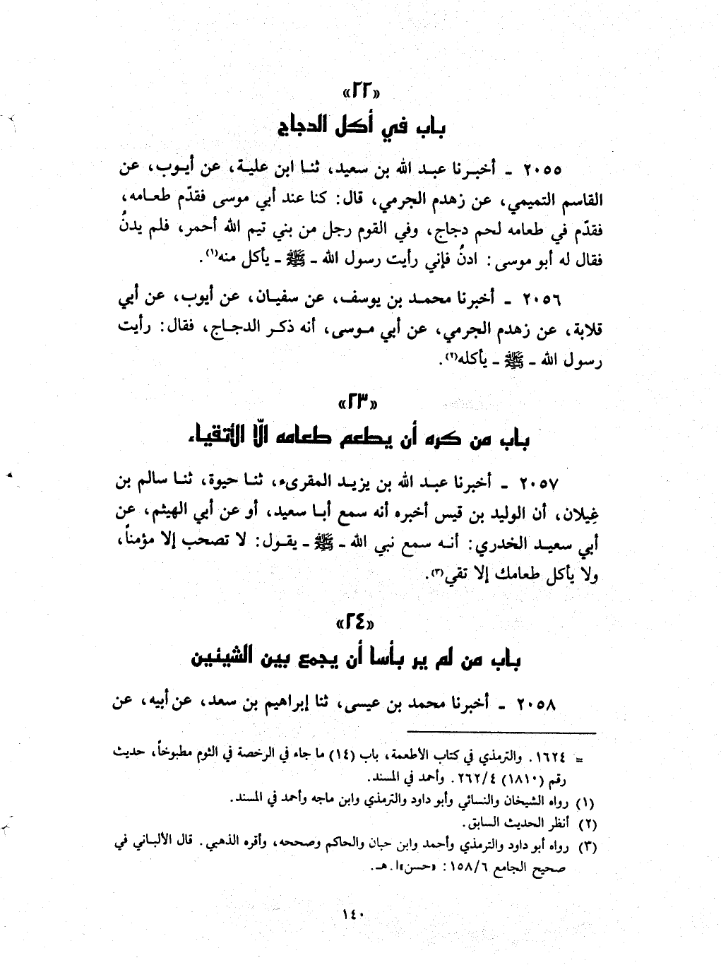 2056 - أخبرنا محمد بن يوسف عن سفيان عن أيوب عن أبي قلابة عن زهدم الجرمي عن أبي موسى : أنه ذكر الدجاج فقال رأيت رسول الله صلى الله عليه و سلم يأكله