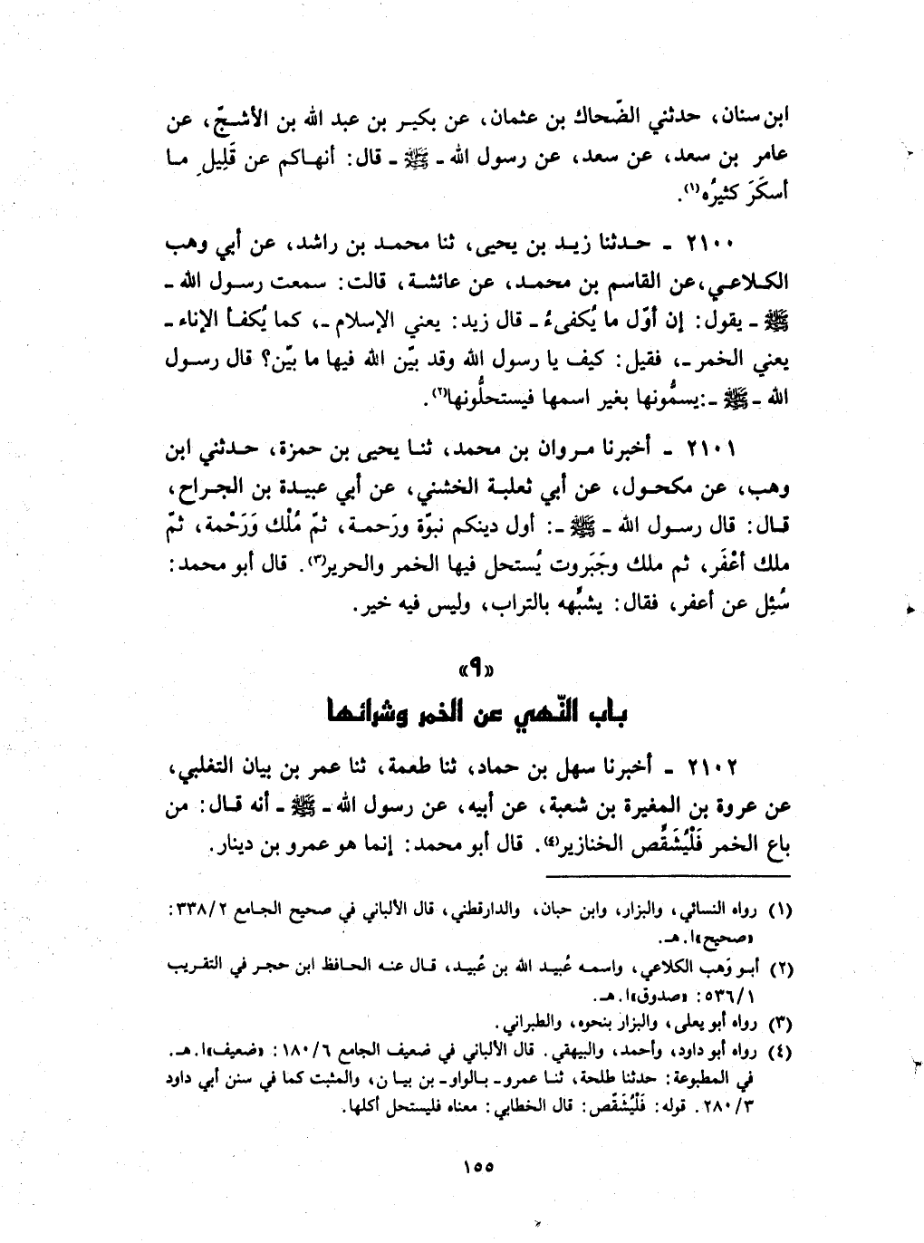 2100 - حدثنا زيد بن يحيى ثنا محمد بن راشد عن أبي وهب الكلاعي عن القاسم بن محمد عن عائشة قالت سمعت رسول الله صلى الله عليه و سلم يقول : إن أول ما يكفيء قال زيد يعني الإسلام كما يكفأ الإناء يعني الخمر فقيل كيف يا رسول الله وقد بين الله فيها ما بين قال رسول الله صلى الله عليه و سلم يسمونها بغير اسمها فيستحلونها