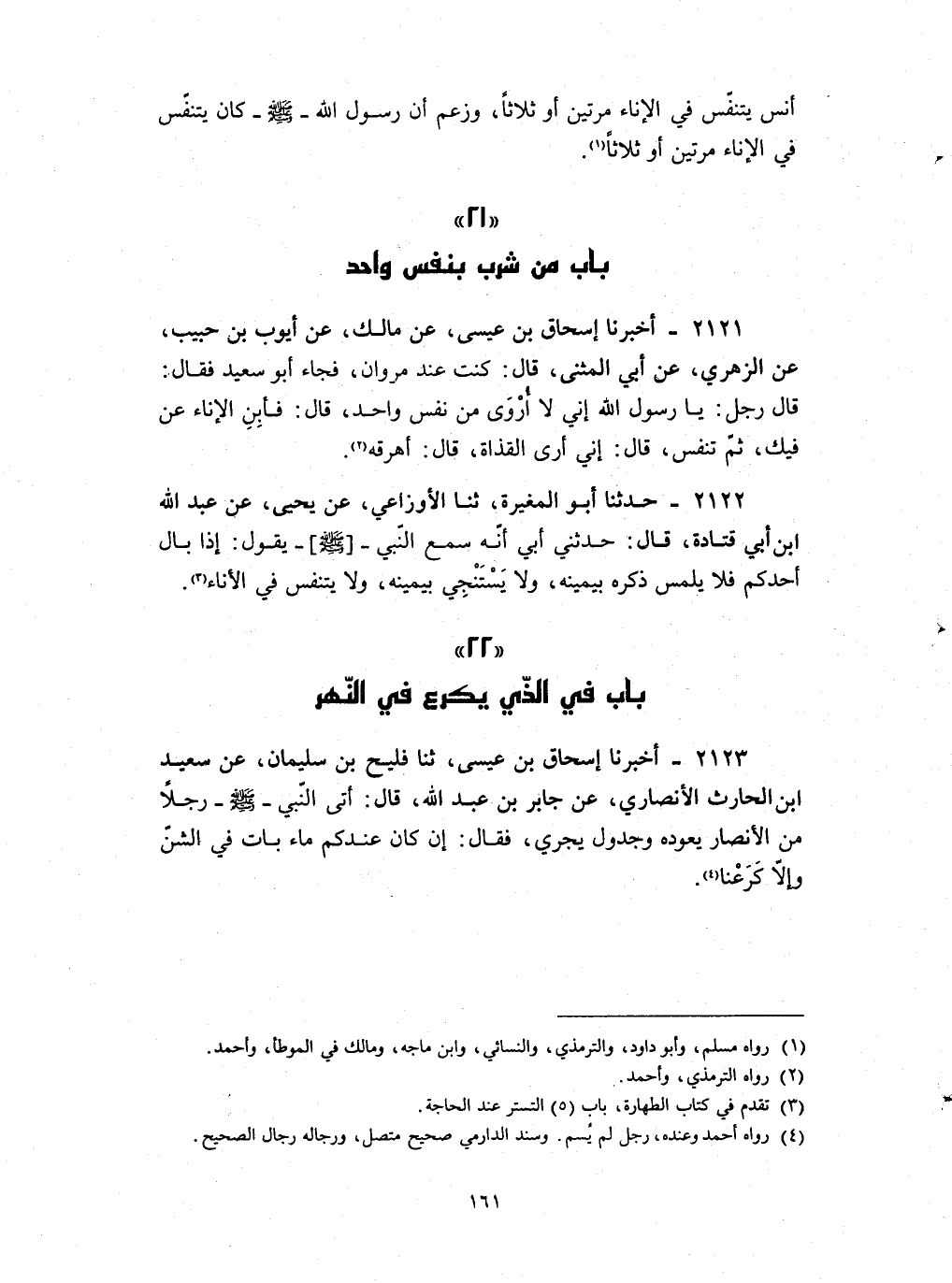 2123 - أخبرنا إسحاق بن عيسى ثنا فليح بن سليمان عن سعيد بن الحارث الأنصاري عن جابر بن عبد الله قال : أتى النبي صلى الله عليه و سلم رجلا من الأنصار يعوده وجدول يجري فقال إن كان عندكم ماء بات في الشن وإلا كرعنا