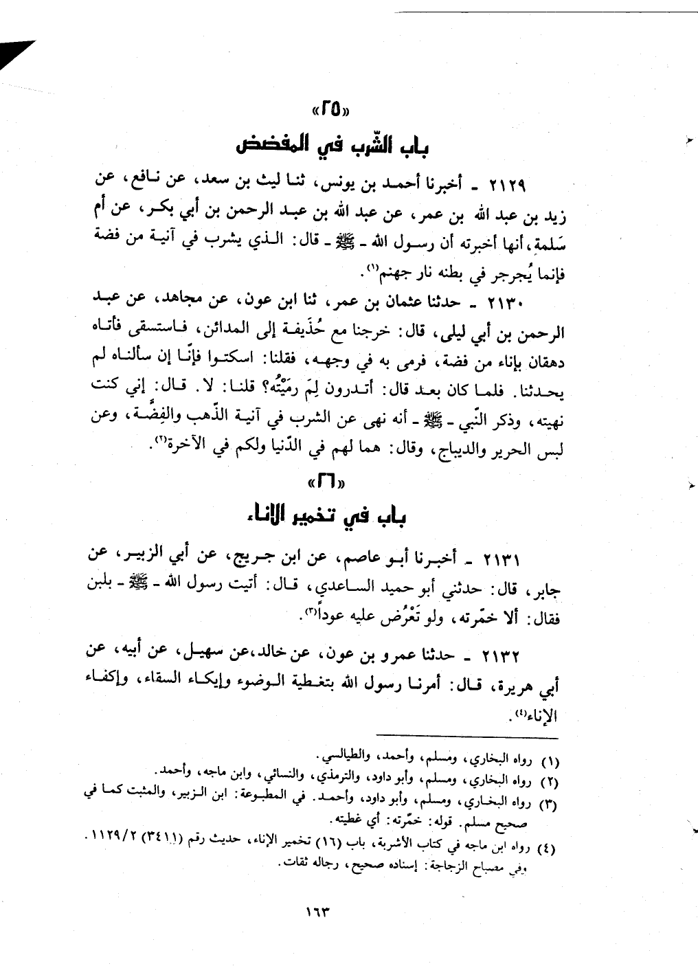 2129 - أخبرنا أحمد بن يونس ثنا ليث بن سعد عن نافع عن زيد بن عبد الله بن عمر عن عبد الله بن عبد الرحمن بن أبي بكر عن أم سلمة انها أخبرته ان رسول الله صلى الله عليه و سلم قال : الذي يشرب في آنيه من فضه فإنما يجرجر في بطنه نار جهنم