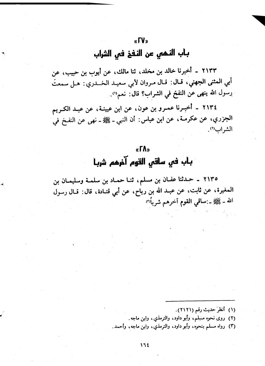 2135 - حدثنا عفان بن مسلم ثنا حماد بن سلمة وسليمان بن المغيرة عن ثابت عن عبد الله بن رباح عن أبي قتادة قال قال رسول الله صلى الله عليه و سلم : ساقي القوم آخرهم شربا