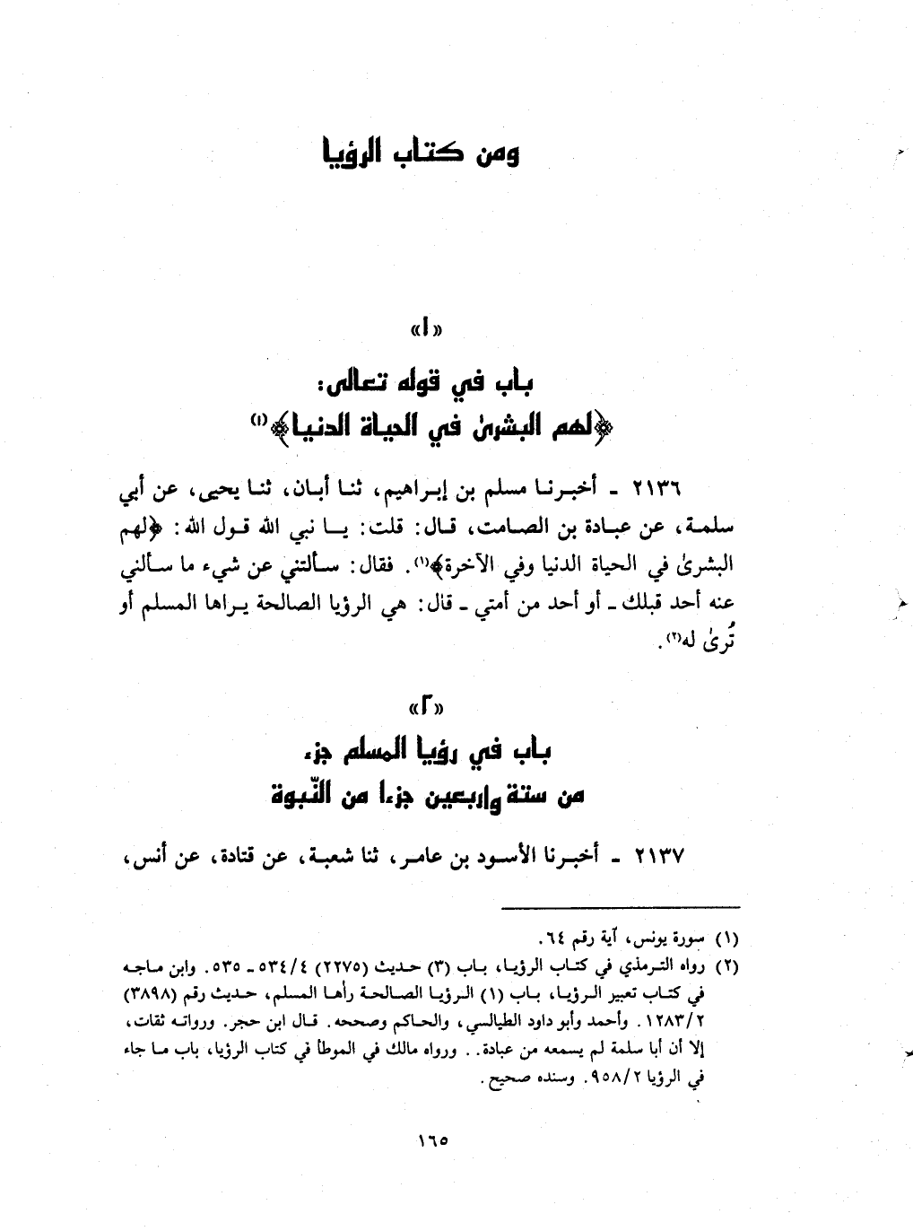 2137 - أخبرنا الأسود بن عامر ثنا شعبة عن قتادة عن أنس عن عبادة بن الصامت عن النبي صلى الله عليه و سلم قال : رؤيا المؤمن جزء من ستة وأربعين جزءا من النبوة