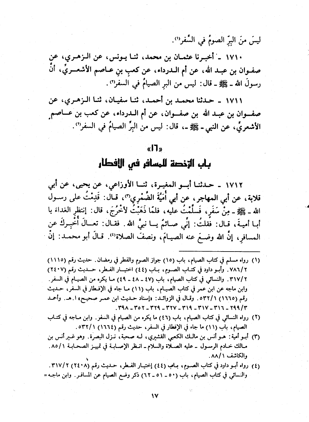1711 - حدثنا محمد بن أحمد ثنا سفيان ثنا الزهري عن صفوان بن عبد الله بن صفوان عن أم الدرداء عن كعب بن عاصم الأشعري عن النبي صلى الله عليه و سلم قال : ليس من البر الصيام في السفر