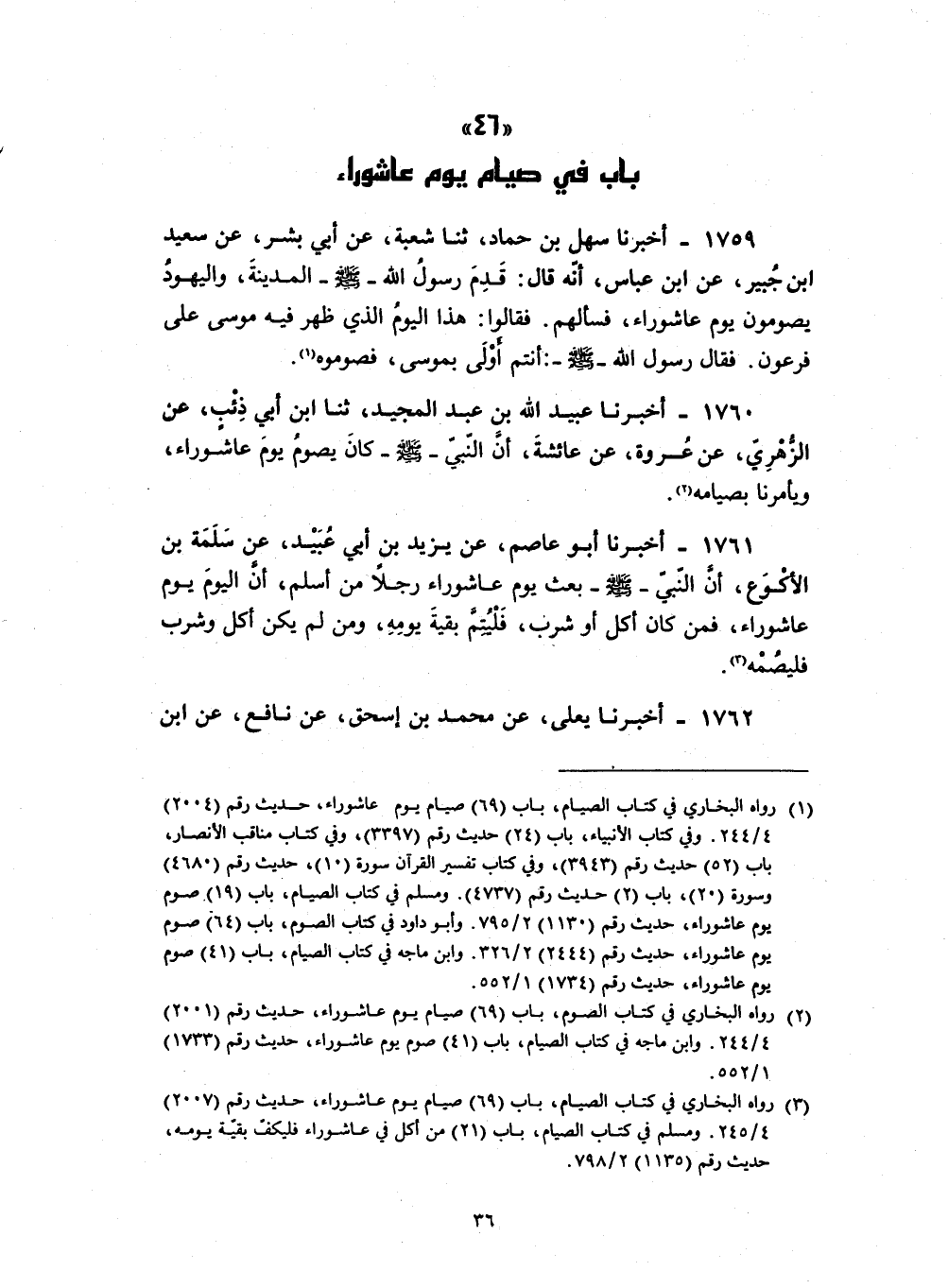 1759 - أخبرنا سهل بن حماد ثنا شعبة عن أبي بشر عن سعيد بن جبير عن بن عباس انه قال : قدم رسول الله صلى الله عليه و سلم المدينة واليهود يصومون يوم عاشوراء فسألهم فقالوا هذا اليوم الذي ظهر فيه موسى على فرعون فقال رسول الله صلى الله عليه و سلم أنتم أولى بموسى فصوموه