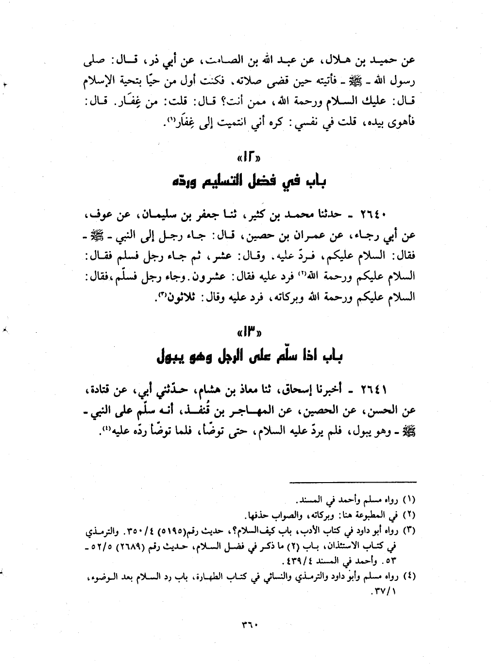 2640 - حدثنا محمد بن كثير ثنا جعفر بن سليمان عن عوف عن أبي رجاء عن عمران بن حصين قال : جاء رجل إلى النبي صلى الله عليه و سلم فقال السلام عليكم فرد عليه وقال عشر ثم جاء رجل فسلم فقال السلام عليكم ورحمة الله فرد عليه فقال عشرون وجاء رجل فسلم فقال السلام عليكم ورحمة الله وبركاته فرد عليه وقال ثلاثون