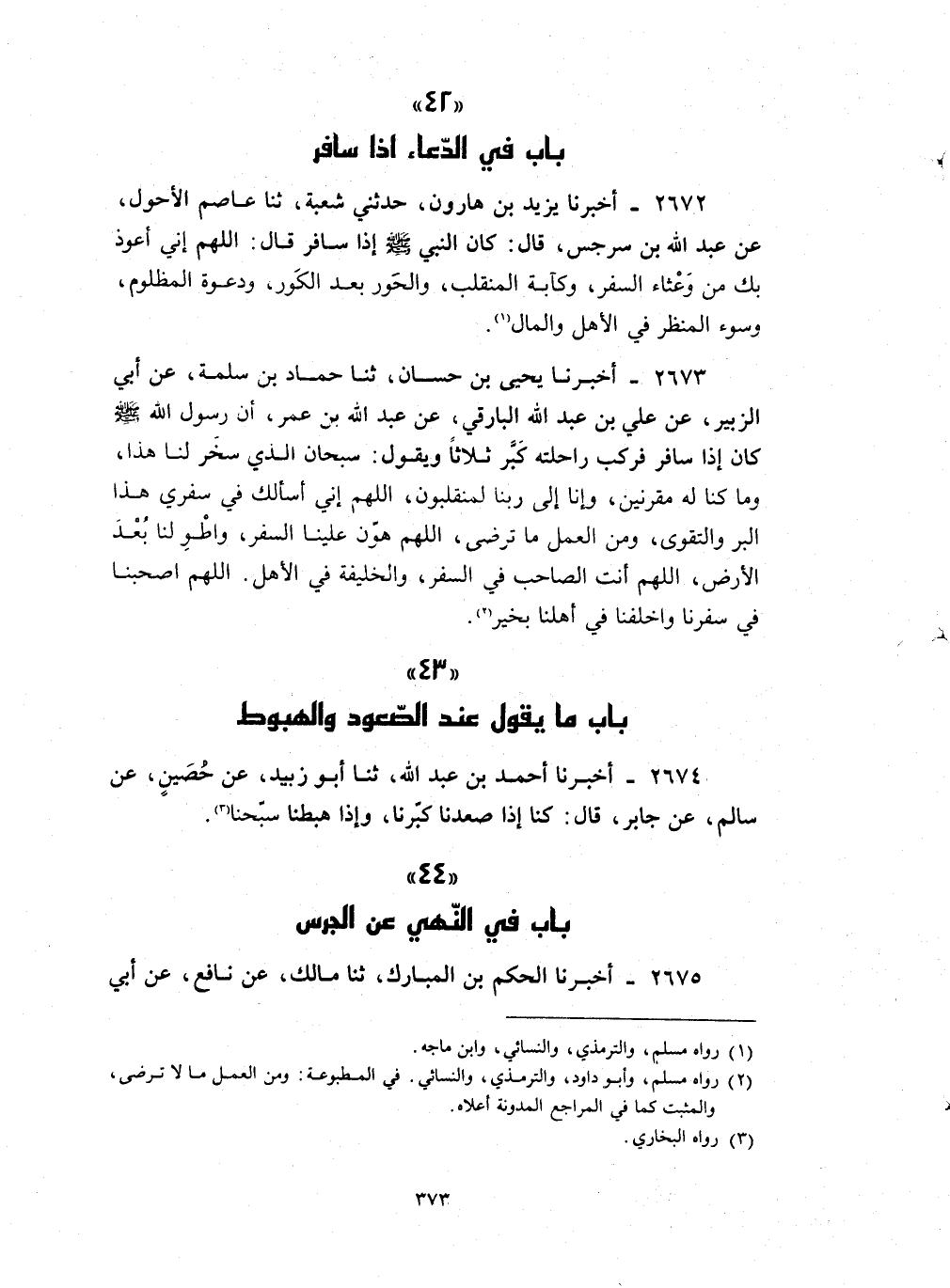 2673 - أخبرنا يحيى بن حسان ثنا حماد بن سلمة عن أبي الزبير عن علي بن عبد الله البارقي عن عبد الله بن عمر : ان رسول الله صلى الله عليه و سلم كان إذا سافر فركب راحلته كبر ثلاثا ويقول { سبحان الذي سخر لنا هذا وما كنا له مقرنين وإنا إلى ربنا لمنقلبون } اللهم اني أسألك في سفري هذا البر والتقوى ومن العمل ما ترضى اللهم هون علينا السفر واطو لنا بعد الأرض اللهم أنت الصاحب في السفر والخليفة في الأهل اللهم اصحبنا في سفرنا واخلفنا في أهلنا بخير