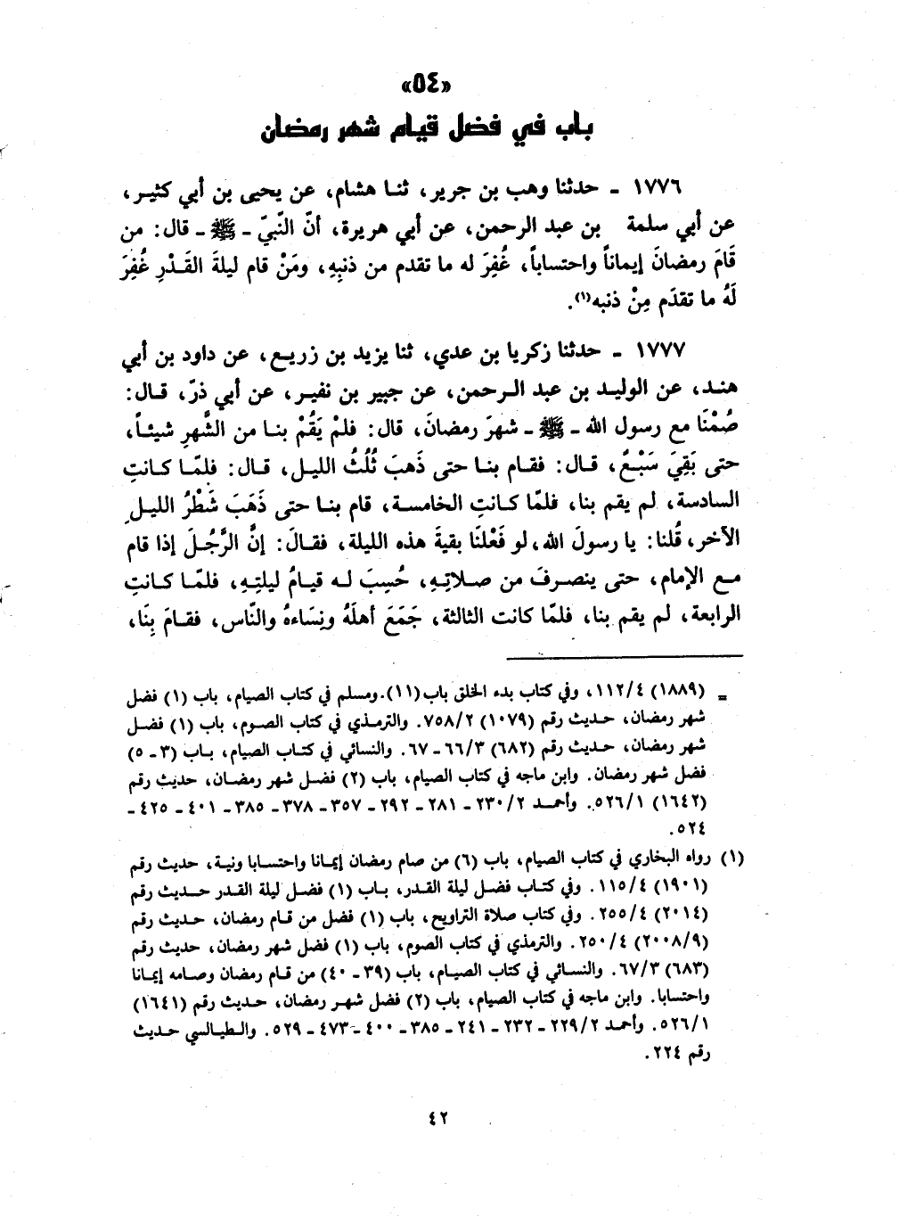 1777 - حدثنا زكريا بن عدي ثنا يزيد بن زريع عن داود بن أبي هند عن الوليد بن عبد الرحمن عن جبير بن نفير عن أبي ذر قال : صمنا مع رسول الله صلى الله عليه و سلم شهر رمضان قال فلم يقم بنا من الشهر شيئا حتى بقي سبع قال فقام بنا حتى ذهب ثلث الليل قال فلما كانت السادسة لم يقم بنا فلما كانت الخامسة قام بنا حتى ذهب شطر الليل الآخر قلنا يا رسول الله لو فعلنا بقية هذه الليلة فقال إن الرجل إذا قام مع الإمام حتى ينصرف من صلاته حسب له قيام ليلته فلما كانت الرابعة لم يقم بنا فلما كانت الثالثة جمع أهله ونساءه والناس فقام بنا حتى خشينا ان يفوتنا الفلاح قلنا وما الفلاح قال السحور قال ثم لم يقم بنا بقية الشهر