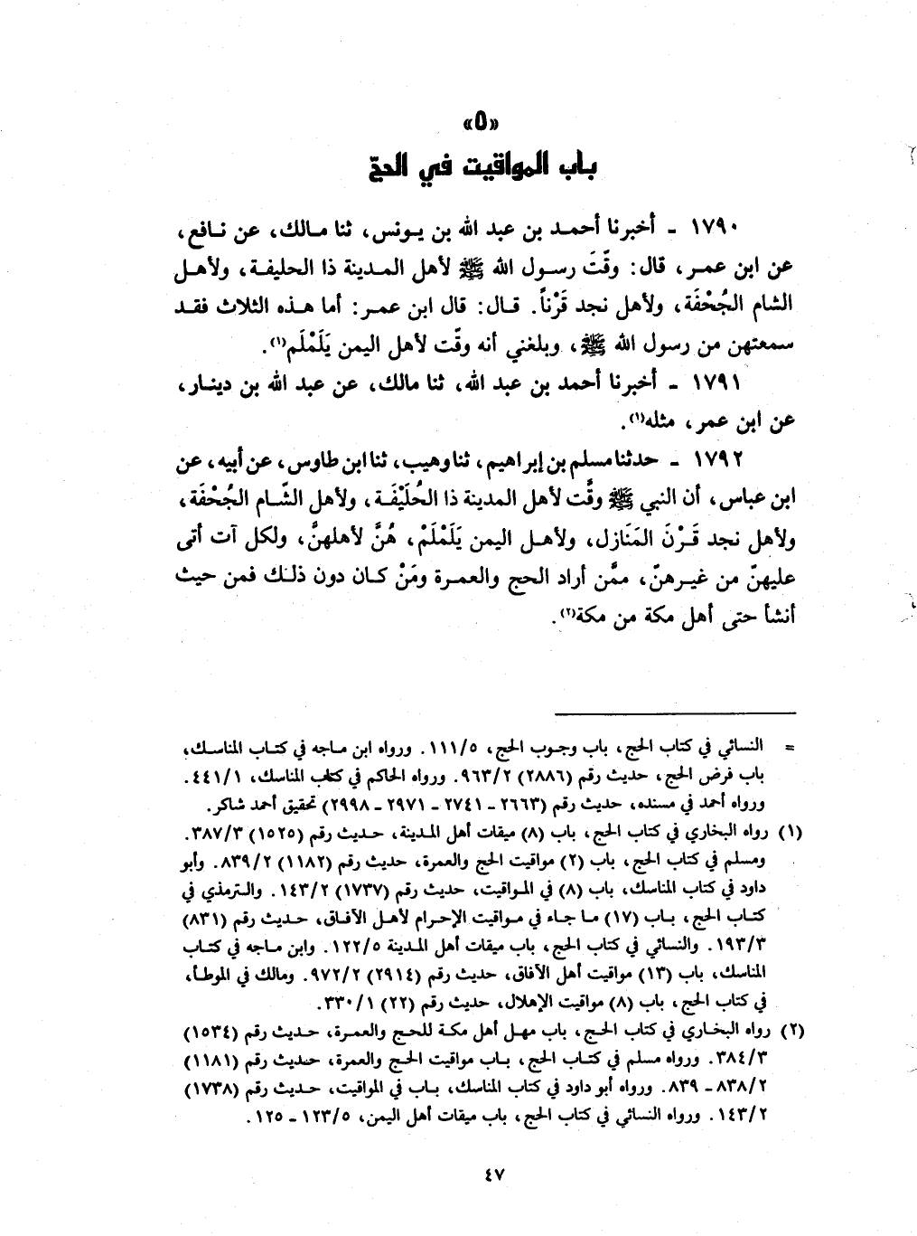 1790 - أخبرنا أحمد بن عبد الله بن يونس ثنا مالك عن نافع عن بن عمر قال : وقت رسول الله صلى الله عليه و سلم لأهل المدينة ذا الحليفة ولأهل الشام الجحفة ولأهل نجد قرنا قال قال بن عمر أما هذه الثلاث فقد سمعتهن من رسول الله صلى الله عليه و سلم وبلغني انه وقت لأهل اليمن يلملم