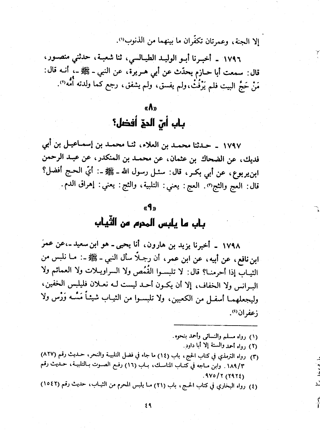 1796 - أخبرنا أبو الوليد الطيالسي ثنا شعبة حدثني منصور قال سمعت أبا حازم يحدث عن أبي هريرة عن النبي صلى الله عليه و سلم انه قال : من حج البيت فلم يرفث ولم يفسق ولم يشفق رجع كما ولدته أمه
