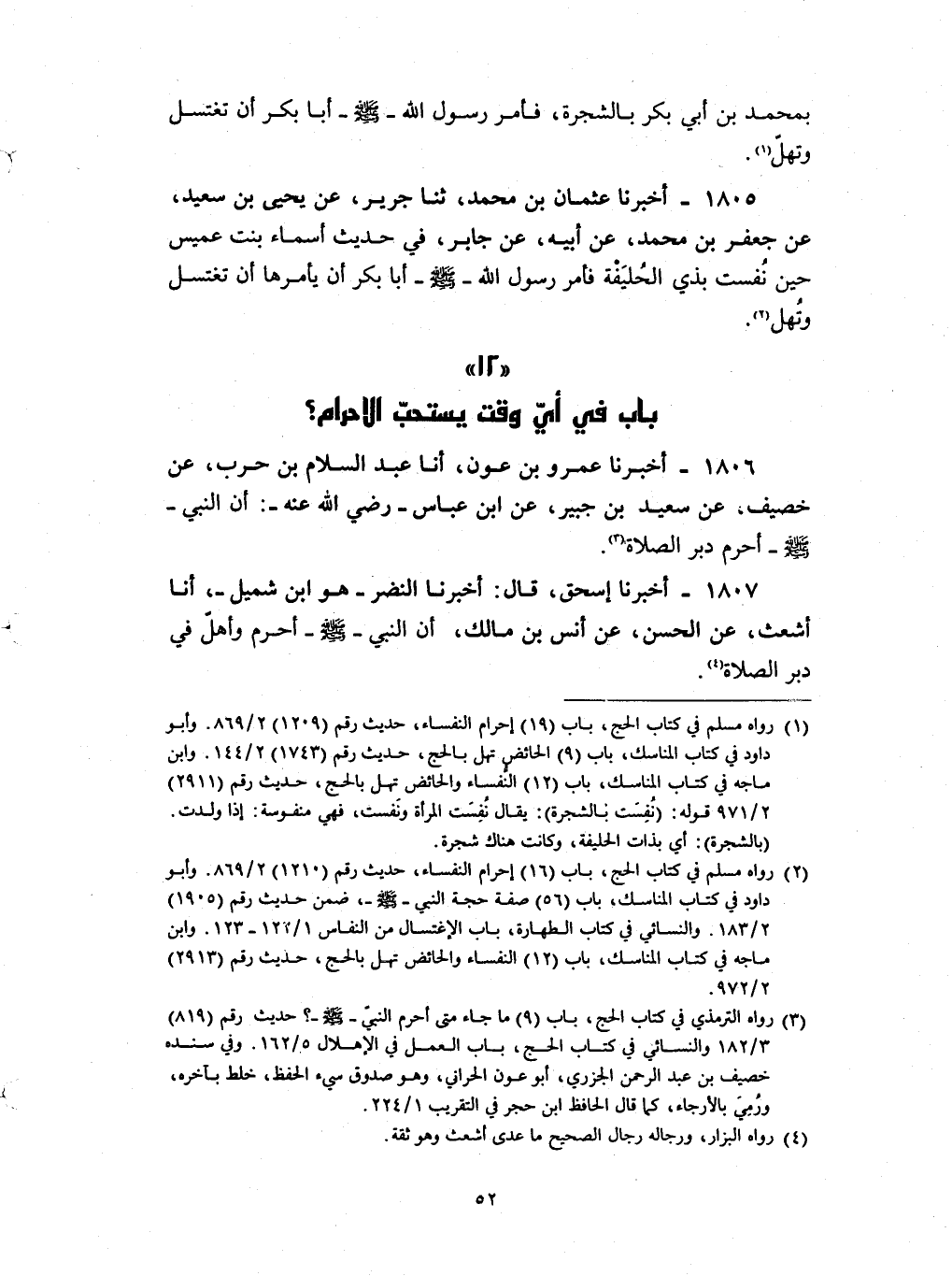 1805 - أخبرنا عثمان بن محمد ثنا جرير عن يحيى بن سعيد عن جعفر بن محمد عن أبيه عن جابر : في حديث أسماء بنت عميس حين نفست بذي الحليفة فأمر رسول الله صلى الله عليه و سلم أبا بكر أن يأمرها ان تغتسل وتهل