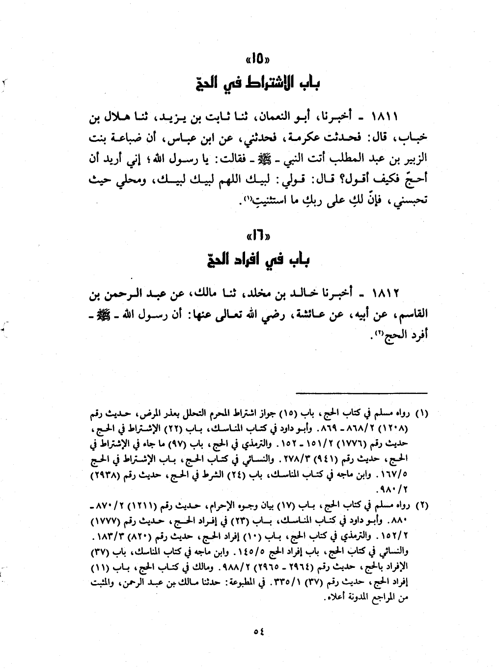 1811 - أخبرنا أبو النعمان ثنا ثابت بن يزيد ثنا هلال بن خباب قال فحدثت عكرمة فحدثني عن بن عباس : أن ضباعة بنت الزبير بن عبد المطلب أتت النبي صلى الله عليه و سلم فقالت يا رسول الله اني أريد ان أحج فكيف أقول قال قولي لبيك اللهم لبيك ومحلي حيث تحبسني فإن لك على ربك ما استثنيت