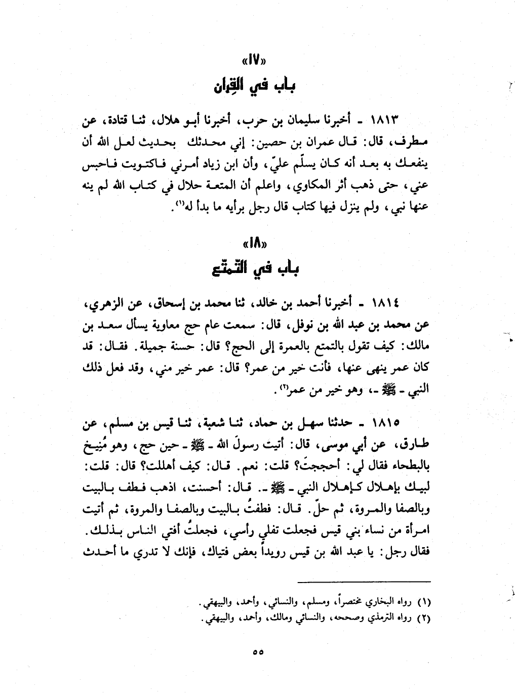 1813 - أخبرنا سليمان بن حرب أخبرنا أبو هلال ثنا قتادة عن مطرف قال قال عمران بن حصين : اني محدثك بحديث لعل الله ان ينفعك به بعد انه كان يسلم علي وان بن زياد أمرني فاكتويت فاحبس عني حتى ذهب أثر المكاوي واعلم ان المتعة حلال في كتاب الله لم ينه عنها نبي ولم ينزل فيها كتاب قال رجل برأيه ما بدا له
