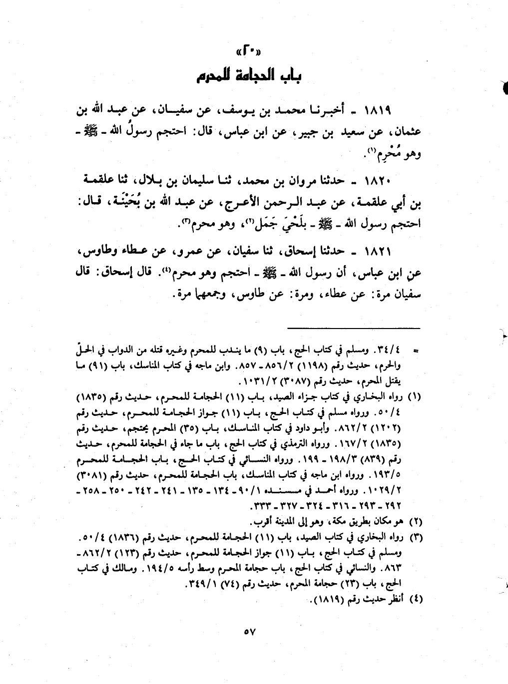 1819 - أخبرنا محمد بن يوسف عن سفيان عن عبد الله بن عثمان عن سعيد بن جبير عن بن عباس قال : احتجم رسول الله صلى الله عليه و سلم وهو محرم