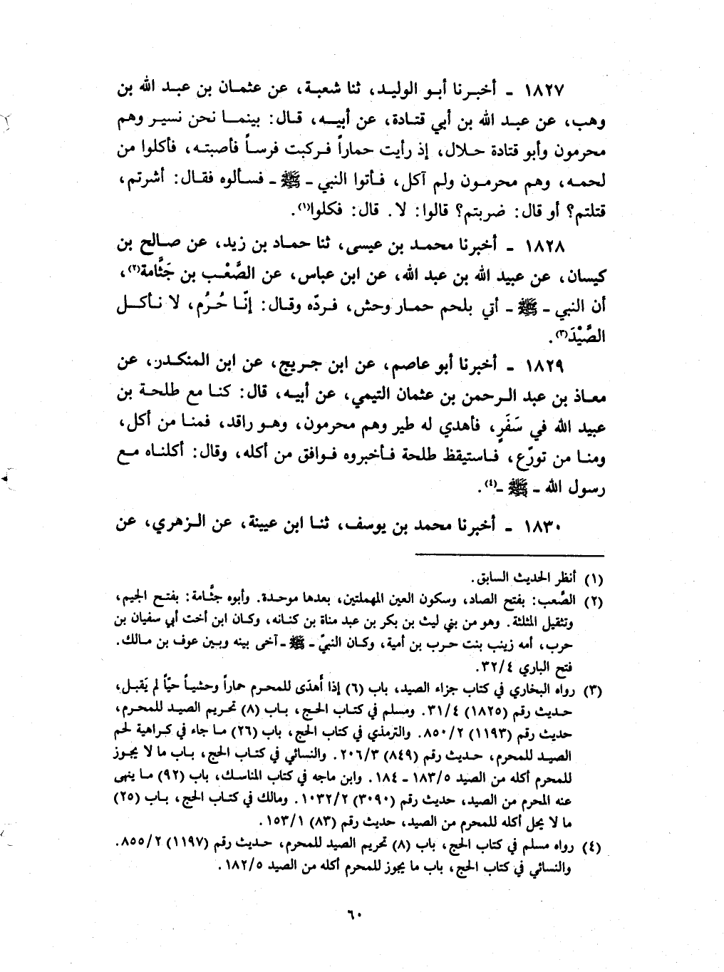 1828 - أخبرنا محمد بن عيسى ثنا حماد بن زيد عن صالح بن كيسان عن عبيد الله بن عبد الله عن بن عباس عن الصعب بن جثامة : ان النبي صلى الله عليه و سلم أتى بلحم حمار وحش فرده وقال إنا حرم لا نأكل الصيد