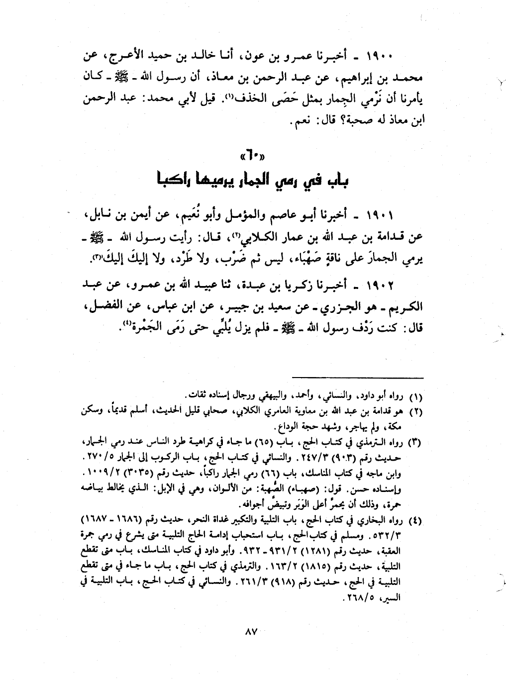 1901 - أخبرنا أبو عاصم والمؤمل وأبو نعيم عن أيمن بن نابل عن قدامة بن عبد الله بن عمار الكلابي قال : رأيت رسول الله صلى الله عليه و سلم يرمي الجمار على ناقة صهباء ليس ثم ضرب ولا طرد ولا إليك إليك