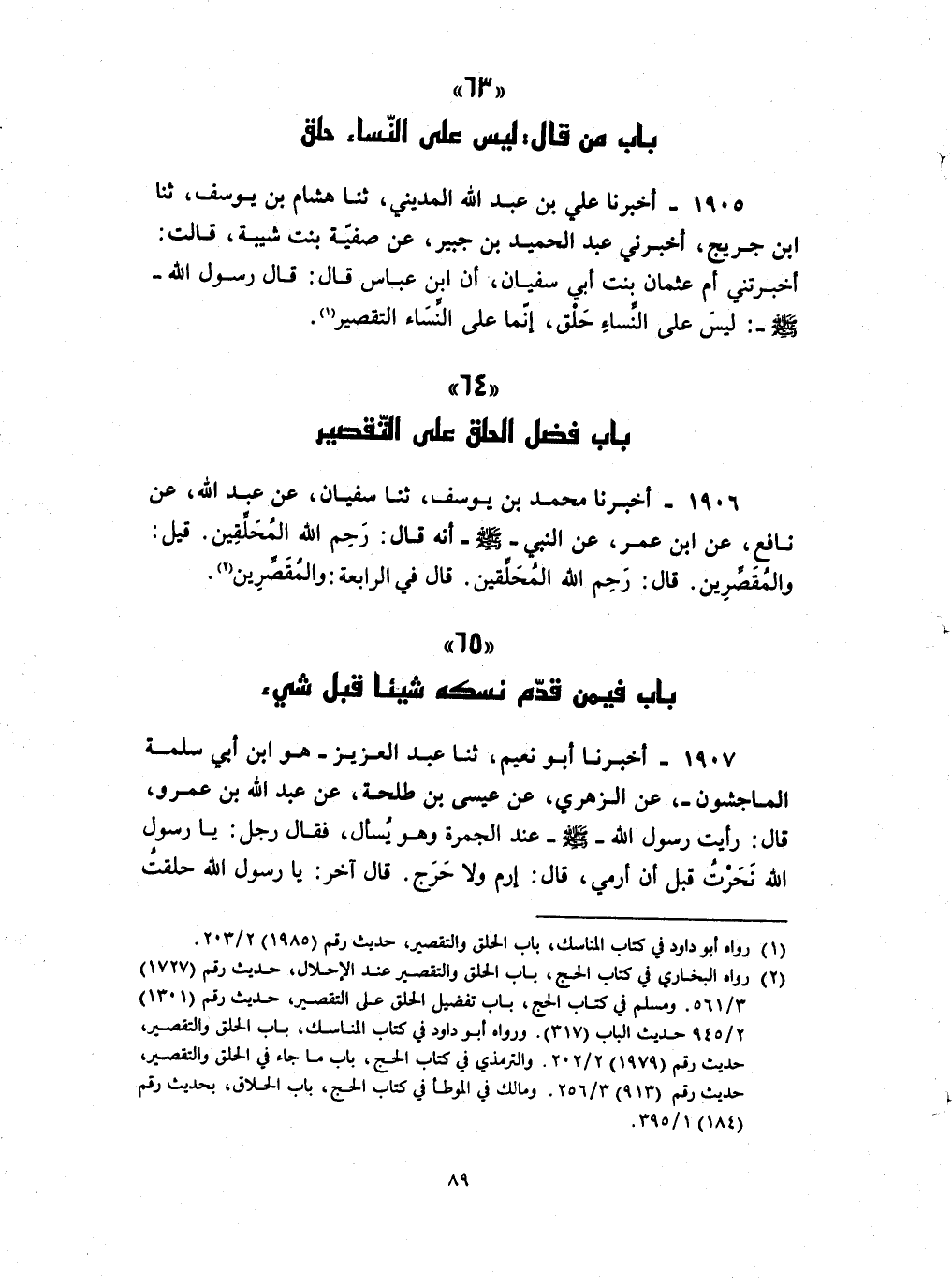 1905 - أخبرنا علي بن عبد الله المديني ثنا هشام بن يوسف ثنا بن جريج أخبرني عبد الحميد بن جبير عن صفية بنت شيبة قالت أخبرتني أم عثمان بنت أبي سفيان أن بن عباس قال قال رسول الله صلى الله عليه و سلم : ليس على النساء حلق إنما على النساء التقصير