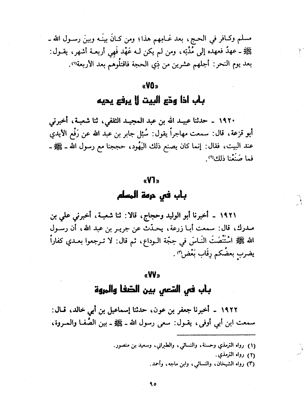 1921 - أخبرنا أبو الوليد وحجاج قالا ثنا شعبة أخبرني علي بن مدرك قال سمعت أبا زرعة يحدث عن جرير بن عبد الله : ان رسول الله صلى الله عليه و سلم استنصت الناس في حجة الوداع ثم قال لا ترجعوا بعدي كفارا يضرب بعضكم رقاب بعض