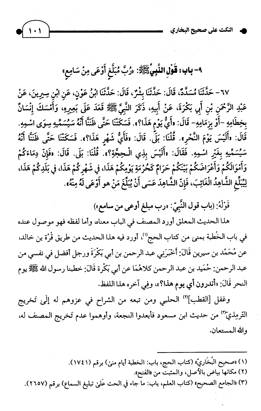 9 - باب: قَوْلِ النَّبيِّ - صلى الله عليه وسلم -: "رُبَّ مُبَلَّغٍ أَوْعَى مِنْ سَامِعٍ"