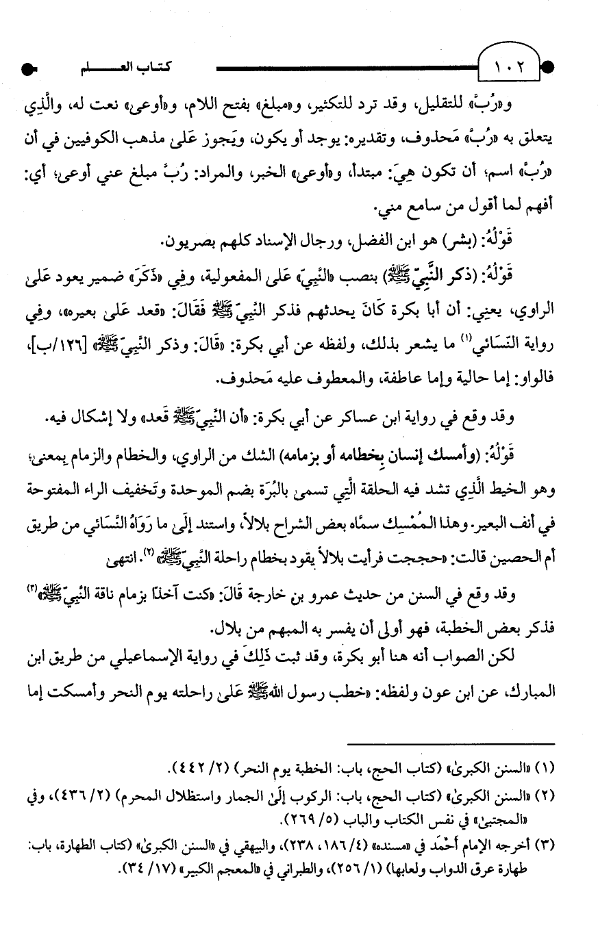 لكن الصواب أنه هنا أبو بكرة، وقد ثبت ذلكَ في رواية الإسماعيلي من طريق ابن المبارك، عن ابن عون ولفظه: "خطب رسول الله - صلى الله عليه وسلم - عَلى راحلته يوم النحر وأمسكت إما