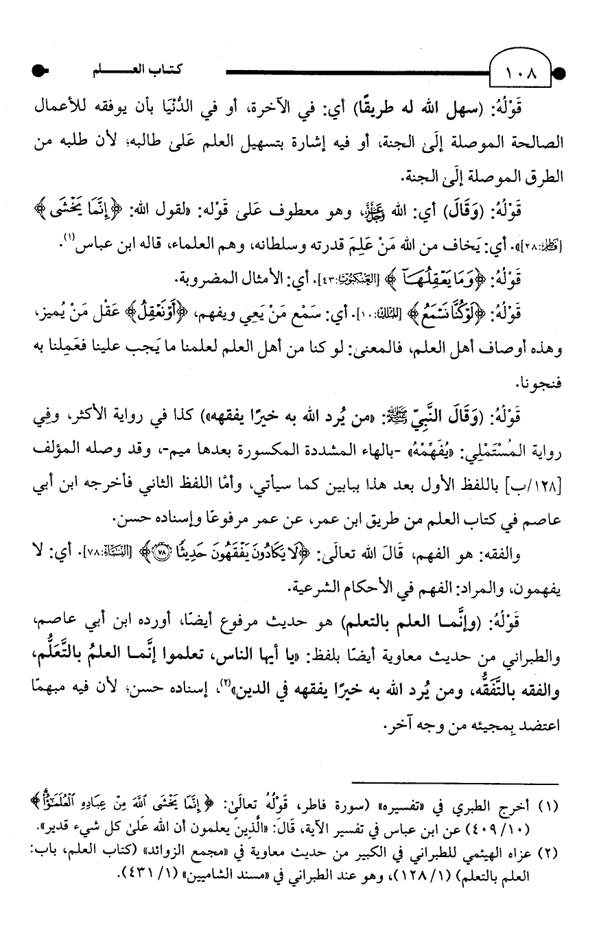 (¬1) أخرج الطبري في "تفسيره" (سورة فاطر، قَوْلُهُ تعالَى: {إِنَّمَا يَخْشَى اللَّهَ مِنْ عِبَادِهِ الْعُلَمَاءُ} (10/ 409) عن ابن عباس في تفسير الآية، قَالَ: "الَّذِين يعلمون أن الله عَلى كل شيء قدير".