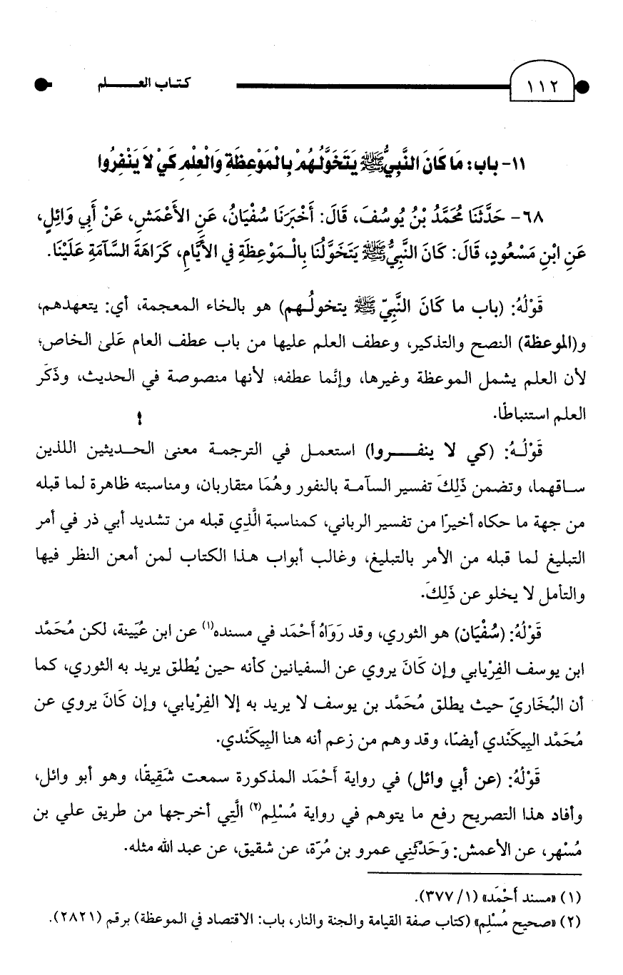 68 - حَدَّثَنَا مُحَمَّدُ بْنُ يُوسُفَ، قَالَ: أَخْبَرَنَا سُفْيَانُ، عَنِ الأَعْمَشِ، عَنْ أَبِي وَائِلٍ، عَنِ ابْنِ مَسْعُودٍ، قَالَ: كَانَ النَّبِيُّ - صلى الله عليه وسلم - يَتَخَوَّلُنَا بِالْمَوْعِظَةِ في الأَيَّامِ، كَرَاهَةَ السَّآمَةِ عَلَيْنَا.