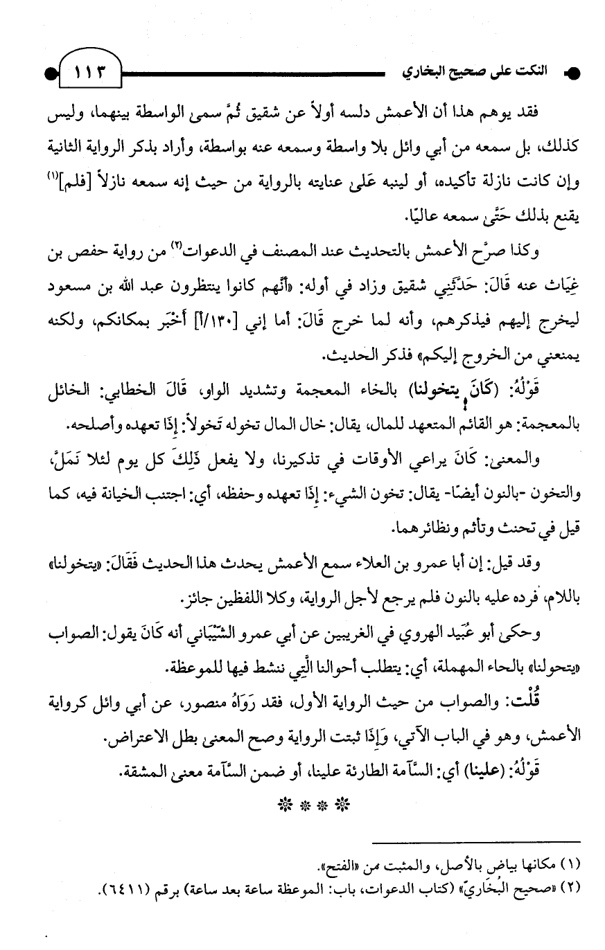 فقد يوهم هذا أن الأعمش دلسه أولًا عن شقيق ثُمَّ سمى الواسطة بينهما، وليس كذلك، بل سمعه من أبي وائل بلا واسطة وسمعه عنه بواسطة، وأراد بذكر الرواية الثانية وإن كافت نازلة تأكيده، أو لينبه عَلى عنايته بالرواية من حيث إنه سمعه نازلًا [فلم] (¬1) يقنع بذلك حَتَّى سمعه عاليًا.
