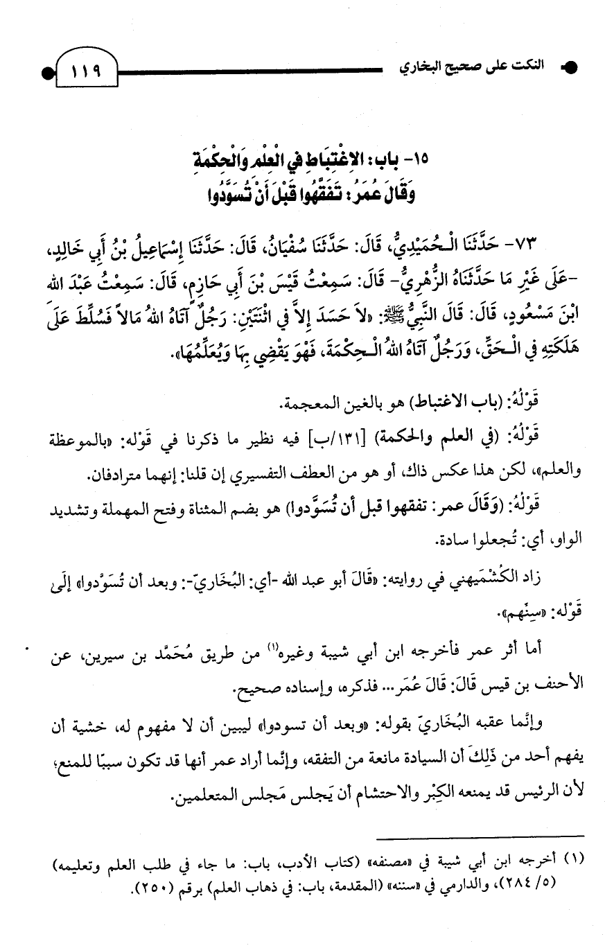 15 - باب: الاغْتِبَاط في الْعِلْمِ وَالْحِكمَةِ وَقَالَ عُمَرُ: تَفَقَّهُوا قَبْلَ أَنْ تُسَوَّدُوا