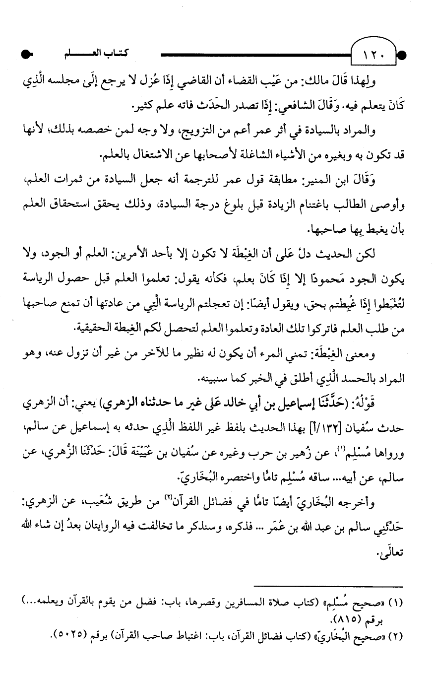 لكن الحديث دلَّ عَلى أن الغِبْطَة لا تكون إلا بأحد الأمرين: العلم أو الجود، ولا يكون الجود مَحمودًا إلا إِذَا كَانَ بعلم، فكأنه يقول: تعلموا العلم قبل حصول الرياسة لتُغبَطوا إِذَا غُبِطتم بحق، ويقول أيضًا: إن تعجلتم الرياسة الَّتِي من عادتها أن تمنع صاحبها من طلب العلم فاتركوا تلك العادة وتعلموا العلم لتحصل لكم الغِبطة الحقيقية.