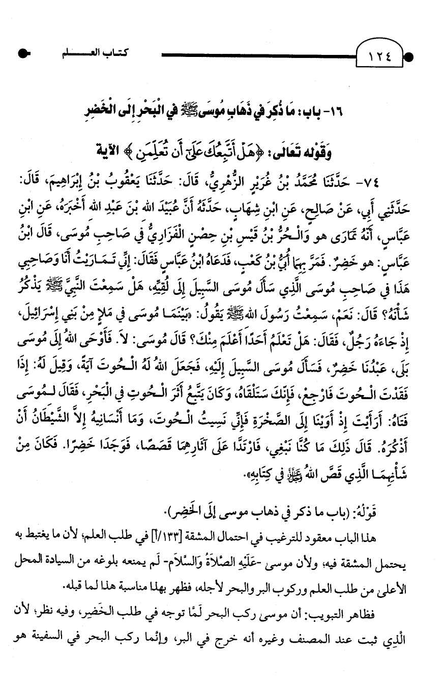 74 - حَدَّثَنَا مُحَمَّدُ بْنُ غُرَيْر الزُّهْرِيُّ، قَالَ: حَدَّثَنَا يَعْقُوبُ بْنُ إِبْرَاهِيمَ، قَالَ: حَدَّثَنِي أَبي، عَنْ صَالِحٍ، عَنِ ابْنِ شِهَابٍ، حَدَّثَهُ أَنَّ عُبَيْدَ اللهِ بْنَ عَبْدِ اللهِ أَخْبَرَهُ، عَنِ ابْنِ عَبَّاسٍ، أَنَّهُ تَمَارَى هو وَالْحُرُّ بْنُ قَيْسِ بْنِ حِصْنٍ الْفَزَارِيُّ في صَاحِبِ مُوسَى، قَالَ ابْنُ عَبَّاسٍ: هو خَضِرٌ. فَمَرَّ بِهِما أُبَيُّ بْنُ كَعْب، فَدَعَاهُ ابْنُ عَبَّاسٍ فَقَالَ: إِنِّي تَمَاريتُ أَنَا وَصَاحِبِي هَذَا في صَاحِبِ مُوسَى الَّذِي سَأل مُوسَى السَّبِيلَ إِلَى لُقِيِّهِ، هَلْ سَمِعْتَ النَّبِيَّ - صلى الله عليه وسلم - يَذْكُرُ شَأْنَهُ؟ قَالَ: نَعَمْ، سَمِعْتُ رَسُولَ الله - صلى الله عليه وسلم - يقُوُل: "بَيْنَمَا مُوسَى في مَلإٍ مِنْ بَني إِسْرَائِيلَ، إِذْ جَاءَهُ رَجُلٌ، فَقَالَ: هَلْ تَعْلَمُ أَحَدًا أَعْلَمَ مِنْكَ؟ قَالَ مُوسَى: لَا. فَأَوْحَى اللهُ إِلَى مُوسَى بَلَى، عَبْدُنَا خَضِرٌ، فَسَأَل مُوسَى السَّبِيلَ إِلَيْهِ، فَجَعَلَ اللهُ لَهُ الْحُوتَ آيَة، وَقِيلَ لَهُ: إِذَا فَقَدْتَ الْحُوتَ فَارْجِعْ، فَإِنَّكَ سَتَلْقَاهُ، وَكانَ يَتَّبعُ أثَرَ الْحُوتِ في الْبَحْرِ، فَقَالَ لمُوسَى فَتَاهُ: أَرَأَيْتَ إِذْ أَوَيْنَا إِلَى الصَّخْرَةِ فَإِنَي نَسِيتُ الْحُوتَ، وَمَا أَنْسَانِيهُ إِلأَ الشَيْطَانُ أَنْ أَذْكُرَهُ. قَالَ ذَلِكَ مَا كُنَّا نَبْغِي، فَارْتَدَّا عَلَى آثَارِهِمَا قَصَصًا، فَوَجَدَا خَضِرًا. فَكَانَ مِنْ شَأْنِهِمَا الَّذِي قَصَّ اللهُ -عز وجل- في كتَابِهِ".
