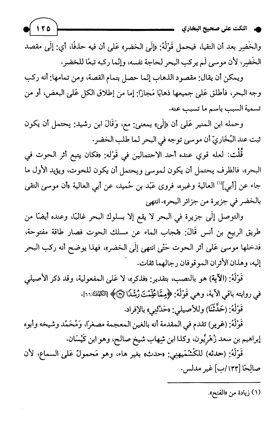 قُلْت: لعله قوي عنده أحد الاحتمالين في قَوْله: "فكان يتبع أثر الحوت في البحر"، فالظرف يحتمل أن يكون لموسى ويحتمل أن يكون للحوت، ويؤيد الأول ما جاء عن [أبي] (¬1) العالية وغيره، فروى عَبْد بن حُميد، عن أبي العالية "أن موسى التقى بالخضر في جزيرة من جزائر البحر". انتهى