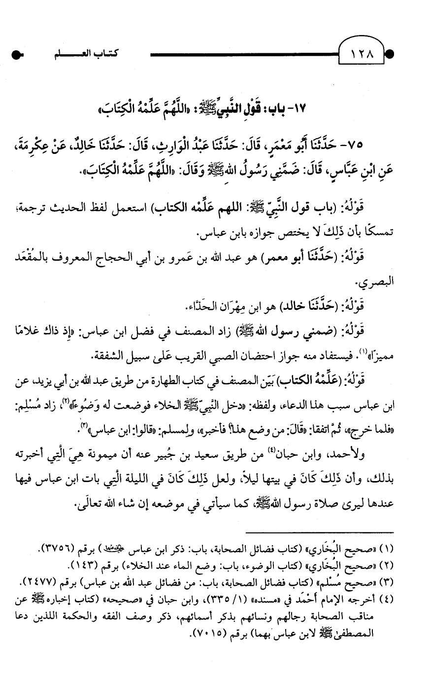 75 - حَدَّثنَا أَبُو مَعْمَرٍ، قَالَ: حَدَّثنَا عَبْدُ الْوَارِثِ، قَالَ: حَدَّثنَا خَالِدٌ، عَنْ عِكْرِمَةَ، عَنِ ابْنِ عَبَّاسٍ، قَالَ: ضَمَّنِي رَسُولُ اللهِ - صلى الله عليه وسلم - وَقَالَ: "اللَّهُمَّ عَلِّمْهُ الْكِتَابَ".