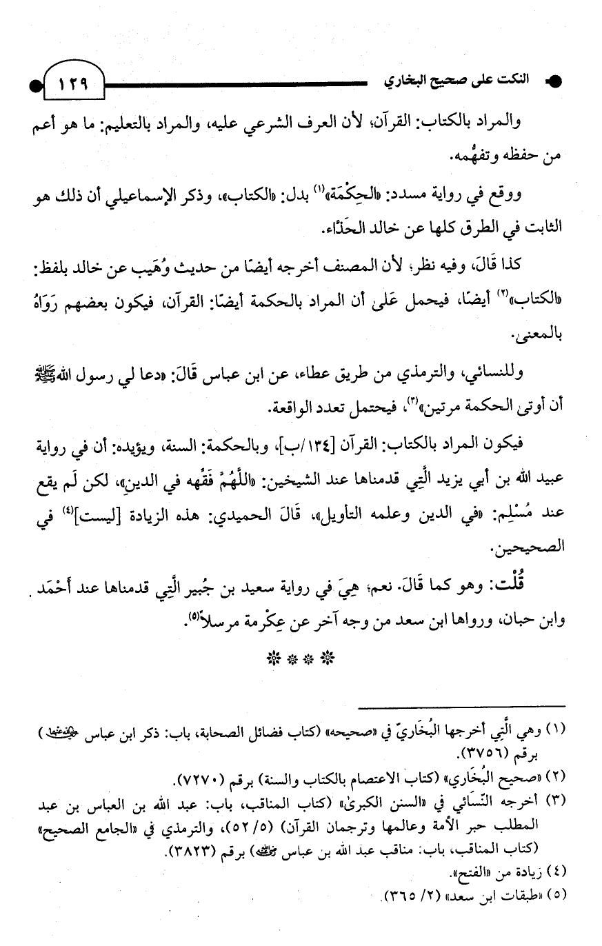كذا قَالَ، وفيه نظر؛ لأن المصنف أخرجه أيضًا من حديث وُهَيب عن خالد بلفظ: "الكتاب" (¬2) أيضًا، فيحمل عَلى أن المراد بالحكمة أيضًا: القرآن، فيكون بعضهم رَوَاهُ بالمعنى.
