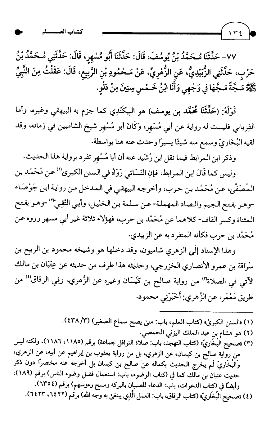 77 - حَدَّثَنا مُحَمَّدُ بْنُ يُوسُفَ، قَالَ: حَدَّثَنَا أَبُو مُسْهِرٍ، قَالَ: حَدَّثَنِي مُحَمَّدُ بْنُ حَرْبٍ، حَدَّثَنِي الزُّبَيْدِيُّ، عَنِ الزُّهْرِيِّ، عَنْ مَحْمُودِ بْنِ الرَّبِيعِ، قَالَ: عَقَلْتُ مِنَ النَّبِيِّ - صلى الله عليه وسلم - مَجَّةً مَجَّهَا في وَجْهِي وَأَنَا ابْنُ خَمْسِ سِنِينَ مِنْ دَلْوٍ.
