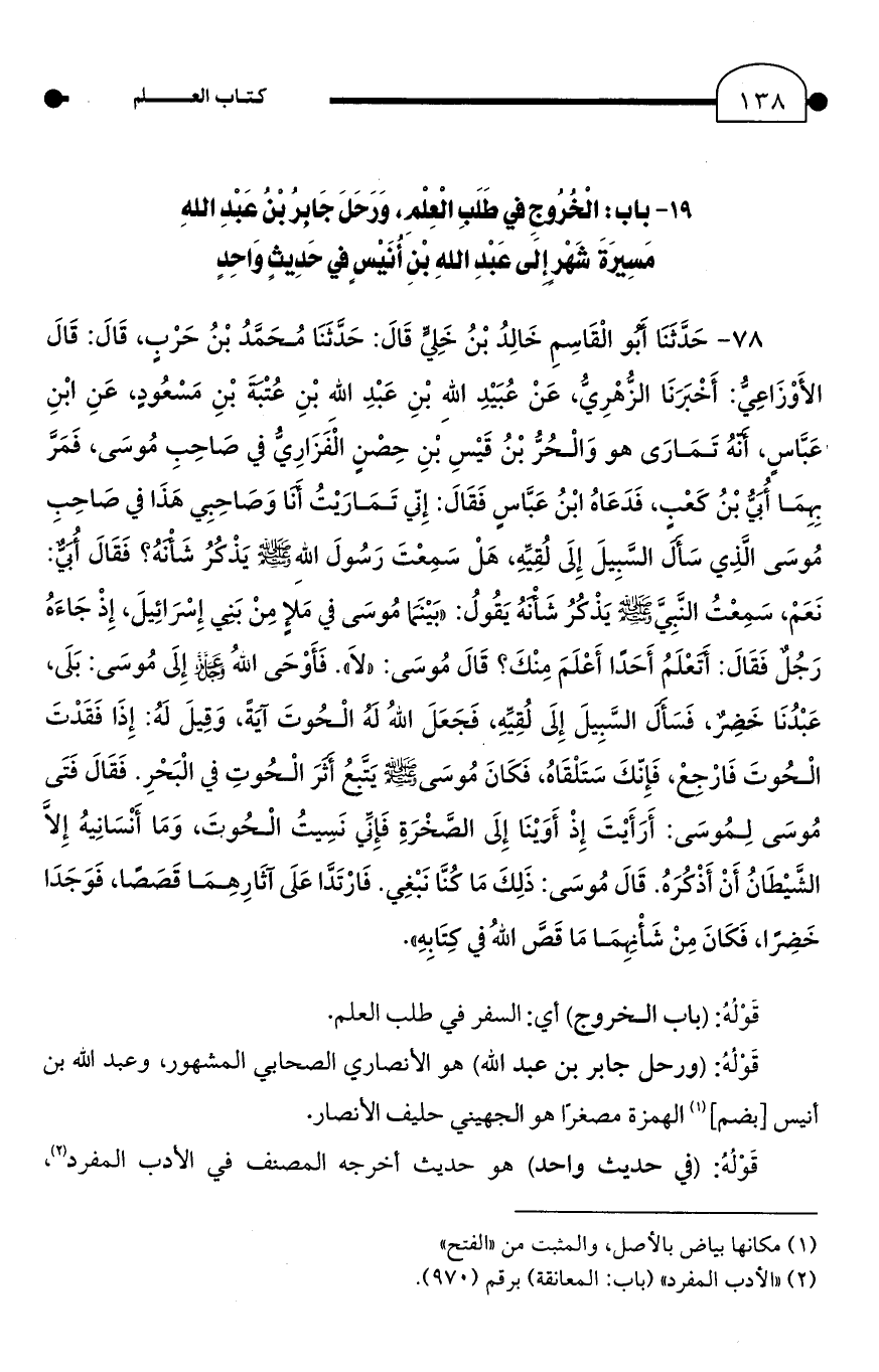 19 - باب: الْخُرُوجِ في طَلَبِ الْعِلْمِ، وَرَحَلَ جَابِرُ بْنُ عَبْدِ اللهِ مَسِيرَةَ شَهْرٍ إلَى عَبْدِ اللهِ بْنِ أُنَيْسٍ في حَدِيثٍ وَاحِدٍ