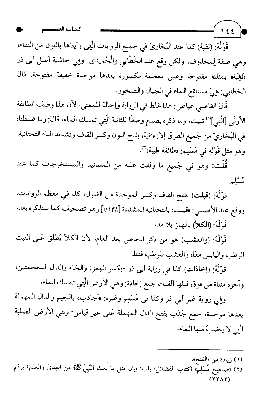 قَالَ القاضي عياض: هذا غلط في الرواية وإحالة للمعنى؛ لأن هذا وصف الطائفة الأُولَى [الَّتِي] (¬1) تنبت، وما ذكره يصلح وصفًا للثانية الَّتِي تمسك الماء، قَالَ: وما ضبطناه في البُخَاريّ من جَميع الطرق إلا: "نقية" بفتح النون وكسر القاف وتشديد الياء التحتانية، وهو مثل قَوْله في مُسْلِم: "طائفة طيبة" (¬2).