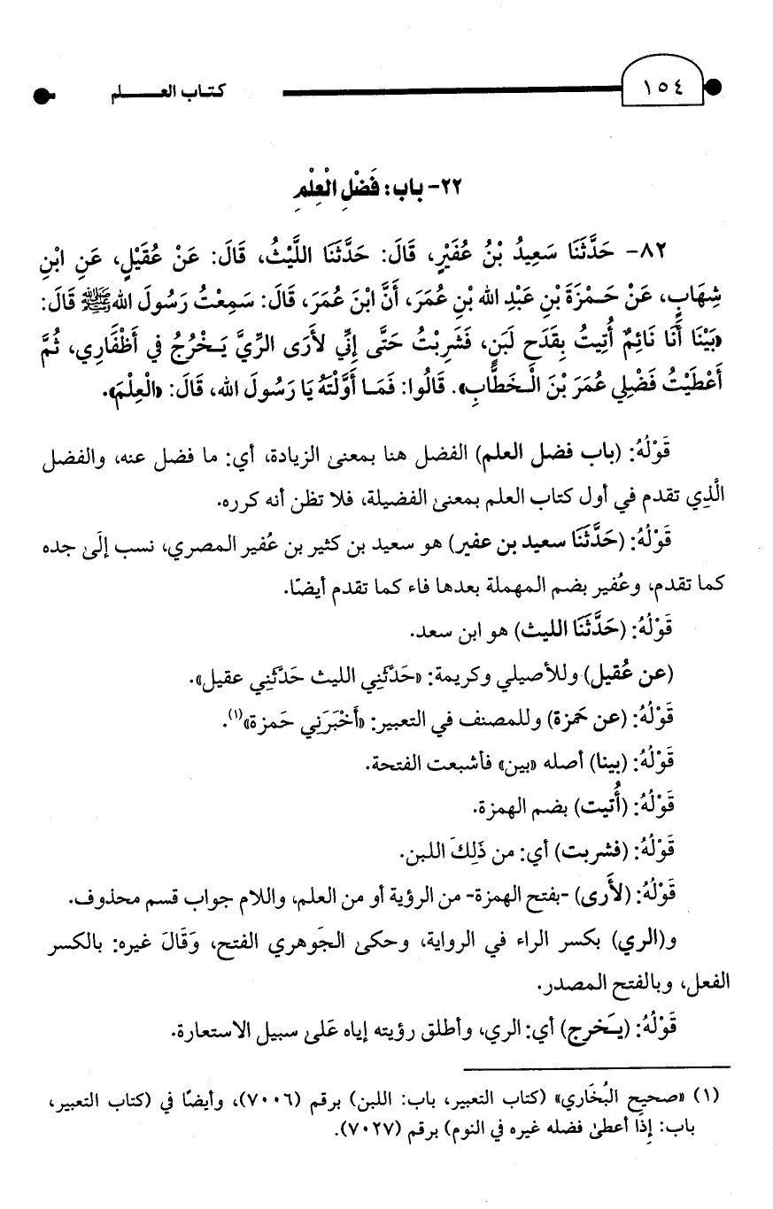 82 - حَدَّثَنَا سَعِيدُ بْنُ عُفَيْرٍ، قَالَ: حَدَّثَنَا اللَّيْثُ، قَالَ: عَنْ عُقَيْلٍ، عَنِ ابْنِ شِهَابٍ، عَنْ حَمْزَةَ بْنِ عَبْدِ الله بْنِ عُمَرَ، أَنَّ ابْنَ عُمَرَ، قَالَ: سَمِعْتُ رَسُولَ الله - صلى الله عليه وسلم - قَالَ: "بَيْنَا أَنَا نَائِمٌ أُتِيتُ بِقَدَحِ لَبَنٍ، فَشَرِبْتُ حَتَّى إِنِّي لأَرَى الرِّيَّ يَخْرُجُ في أَظْفَارِي، ثُمَّ أَعْطَيْتُ فَضْلِي عُمَرَ بْنَ الْخَطَّابِ". قَالُوا: فَمَا أَوَّلْتَهُ يَا رَسُولَ الله، قَالَ: "الْعِلْمَ".
