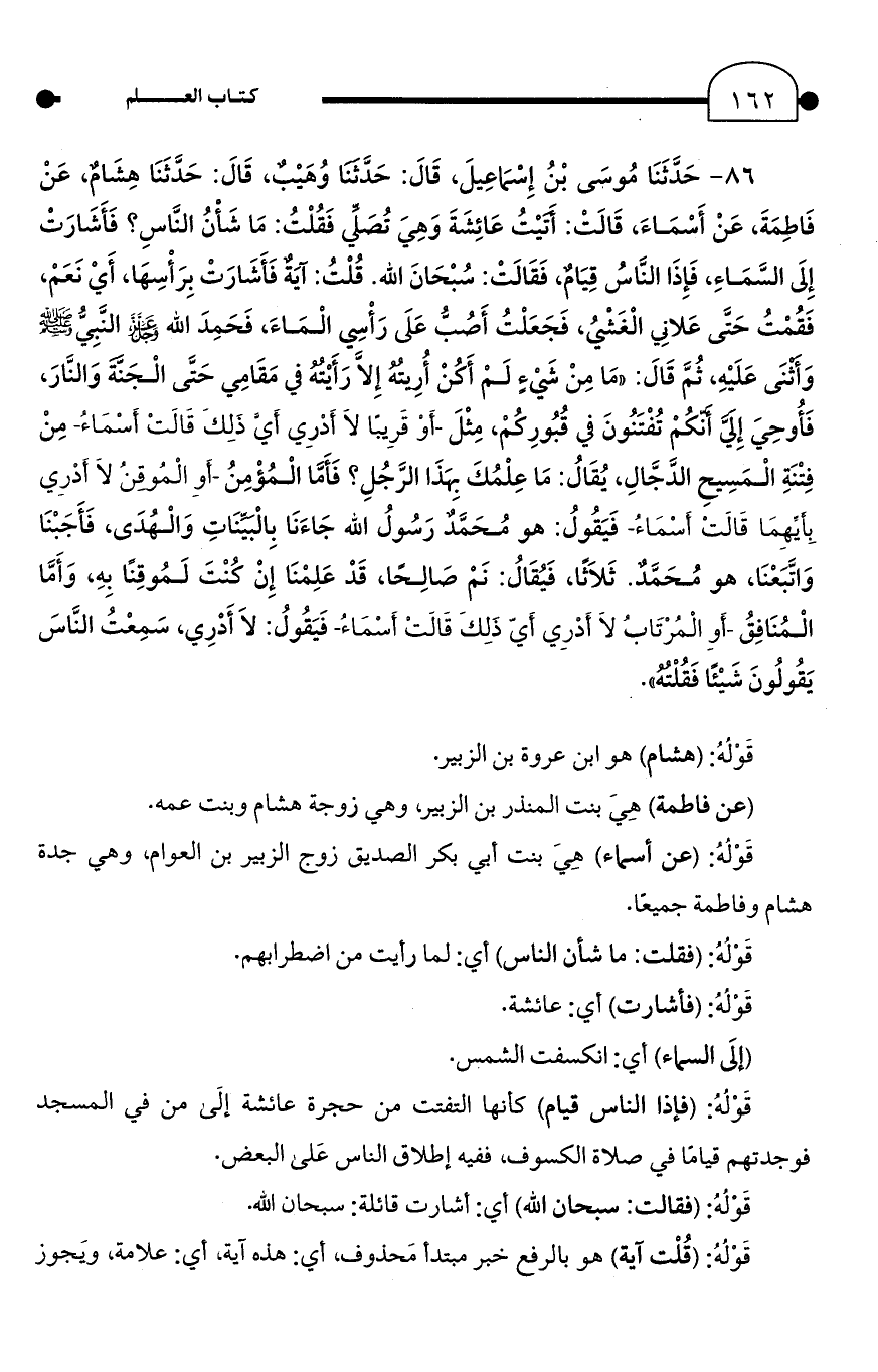 86 - حَدَّثَنَا مُوسَى بْنُ إِسْمَاعِيلَ، قَالَ: حَدَّثَنَا وُهَيْبٌ، قَالَ: حَدَّثَنَا هِشَامٌ، عَنْ فَاطِمَةَ، عَنْ أَسْمَاءَ، قَالَتْ: أَتَيْتُ عَائِشَةَ وَهِيَ تُصَلِّي فَقُلْتُ: مَا شَأْنُ النَّاسِ؟ فَأَشَارَتْ إِلَى السَّمَاءِ، فَإِذَا النَّاسُ قِيَامٌ، فَقَالَتْ: سُبْحَانَ الله. قُلْتُ: آيَةٌ فَأَشَارَتْ بِرَأْسِهَا، أَيْ نَعَمْ، فَقُمْتُ حَتَّى عَلانِي الْغَشْيُ، فَجَعَلْتُ أَصُبُّ عَلَى رَأْسِي الْمَاءَ، فَحَمِدَ الله -عزَّ وجلَّ- النَّبِيُّ - صلى الله عليه وسلم - وَأَثْنَى عَلَيْهِ، ثُمَّ قَالَ: "مَا مِنْ شَيْءٍ لَمْ أَكُنْ أُرِيتُهُ إِلَّا رَأَيْتُهُ في مَقَامِي حَتَّى الْجَنَّةَ وَالنَّارَ، فَأُوحِيَ إِلَيَّ أَنَّكُمْ تُفْتَنُونَ في قُبُورِكُمْ، مِثْلَ -أَوْ قَرِيبًا لَا أَدْرِي أَيَّ ذَلِكَ قَالَتْ أَسْمَاءُ- مِنْ فِتْنَةِ الْمَسِيحِ الدَّجَّالِ، يُقَالُ: مَا عِلْمُكَ بِهَذَا الرَّجُلِ؟ فَأَمَّا الْمُؤْمِنُ -أَوِ الْمُوْقِنُ لَا أَدْرِي بِأيِّهِمَا قَالَتْ أَسْمَاءُ- فَيَقُولُ: هو مُحَمَّدٌ رَسُولُ الله جَاءَنَا بِالْبَيِّنَاتِ وَالْهُدَى، فَأَجَبْنَا وَاتَّبَعْنَا، هو مُحَمَّدٌ. ثَلَاثًا، فَيُقَالُ: نَمْ صَالِحًا، قَدْ عَلِمْنَا إِنْ كُنْتَ لَمُوقِنًا بِهِ، وَأَمَّا الْمُنَافِقُ -أَوِ الْمُرْتَابُ لَا أَدْرِي أَيّ ذَلِكَ قَالَتْ أَسْمَاءُ- فَيَقُولُ: لَا أَدْرِي، سَمِعْتُ النَّاسَ يَقُولُونَ شَيْئًا فَقُلْتُهُ".