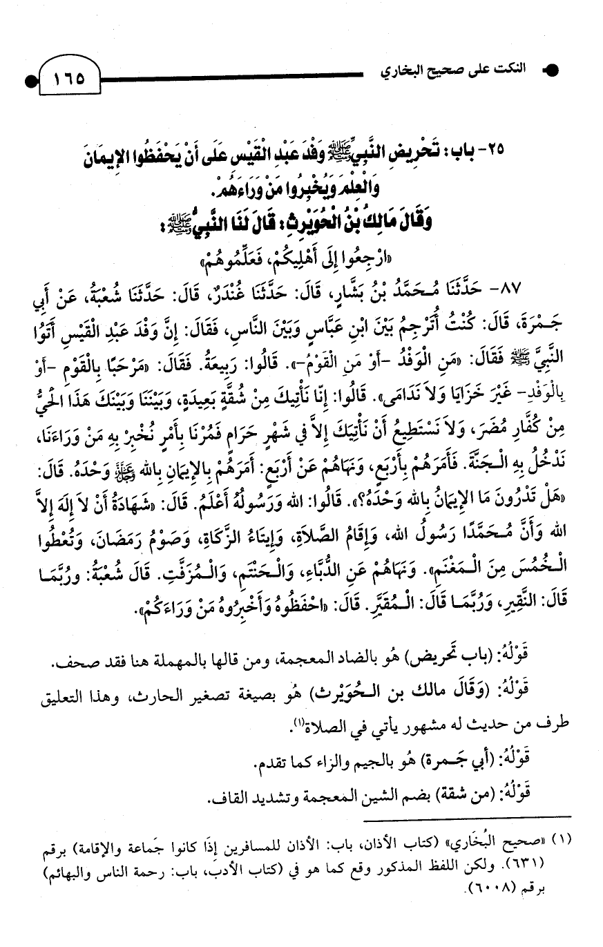 87 - حَدَّثَنَا مُحَمَّدُ بْنُ بَشَّارٍ، قَالَ: حَدَّثَنَا غُنْدَرٌ، قَالَ: حَدَّثَنَا شُعْبَةُ، عَنْ أَبِي جَمْرَةَ، قَالَ: كُنْتُ أُتَرْجِمُ بَيْنَ ابْنِ عَبَّاسٍ وَبَيْنَ النَّاسِ، فَقَالَ: إِنَّ وَفْدَ عَبْدِ الْقَيْسِ أَتَوُا النَّبِيَّ - صلى الله عليه وسلم - فَقَالَ: "مَنِ الْوَفْدُ -أَوْ مَنِ الْقَوْمُ-". قَالُوا: رَبِيعَةُ. فَقَالَ: "مَرْحَبًا بِالْقَوْمِ -أَوْ بِالْوَفْدِ- غَيْرَ خَزَايَا وَلَا نَدَامَى". قَالُوا: إِنّا نَأْتِيكَ مِنْ شُقَّةٍ بعِيدَةٍ، وَبَيْنَنَا وَبَيْنَكَ هَذَا الحيُّ مِنْ كُفَّارِ مُضَرَ، وَلَا نَسْتَطِيعُ أَنْ نَأْتِيَكَ إِلَّا في شَهْرٍ حَرَامٍ فَمُرْنَا بِأَمْرٍ نُخْبِرْ بِهِ مَنْ وَرَاءَنَا، نَدْخُلُ بِهِ الْجَنَّةَ. فَأَمَرَهُمْ بِأَرْبَعٍ، وَنَهَاهُمْ عَنْ أَرْبَعٍ: أَمَرَهُمْ بِالإِيمَانِ بِالله -عَزَّ وجلَّ- وَحْدَهُ. قَالَ: "هَلْ تَدْرُونَ مَا الإِيمَانُ بِالله وَحْدَهُ؟ ". قَالُوا: الله وَرَسُولُهُ أَعْلَمُ. قَالَ: "شَهَادَةُ أَنْ لَا إِلَهَ إِلَّا الله وَأَنَّ مُحَمَّدًا رَسُولُ الله، وَإِقَامُ الصَّلَاةِ، وَإِيتَاءُ الزَّكَاةِ، وَصَوْمُ رَمَضَانَ، وَتُعْطُوا الْخُمُسَ مِنَ الْمَغْنَمِ". وَنَهَاهُمْ عَنِ الدُّبَّاءِ، وَالْحَنْتَمِ، وَالْمُزَفَّتِ. قَالَ شُعْبَةُ: ورُبَّمَا قَالَ: النَّقِيرِ، وَرُبُّمَا قَالَ: الْمُقَيَّرِ. قَالَ: "احْفَظُوهُ وَأَخْبِرُوهُ مَنْ وَرَاءَكُمْ".