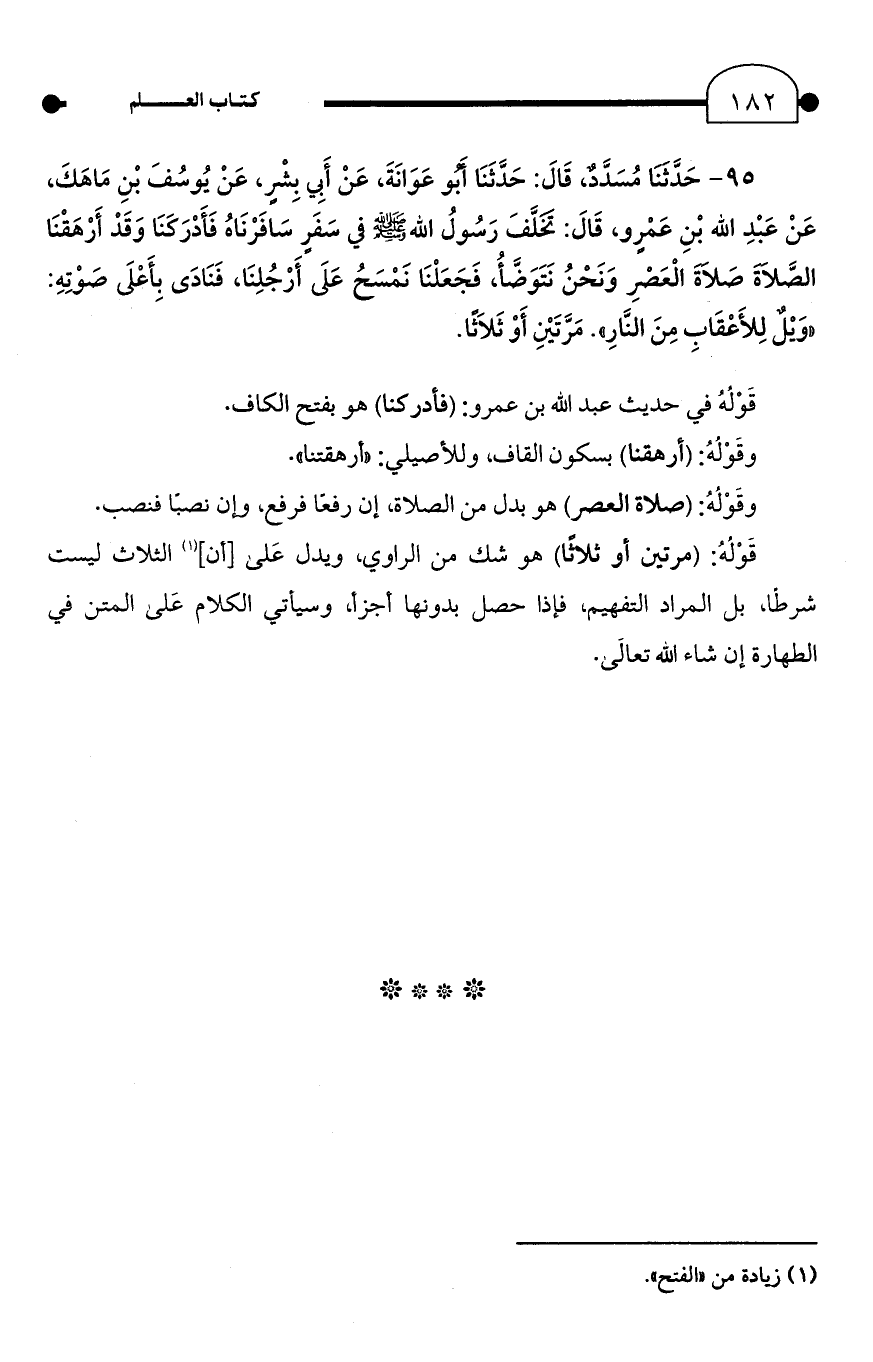 95 - حَدَّثَنَا مُسَدَّدٌ، قَالَ: حَدَّثَنَا أبُو عَوَانَةَ، عَنْ أَبِي بِشْرٍ، عَنْ يُوسُفَ بْنِ مَاهَكَ، عَنْ عَبْدِ الله بْنِ عَمْرٍو، قَالَ: تخَلَّفَ رَسُولُ الله - صلى الله عليه وسلم - في سَفَرٍ سَافَرْنَاهُ فَأَدْرَكَنَا وَقَدْ أَرْهَقْنَا الصَّلاةَ صَلاةَ الْعَصْرِ وَنَحْنُ نَتَوَضَّأُ، فَجَعَلْنَا نَمْسَحُ عَلَى أَرْجُلِنَا، فَنَادَى بِأَعْلَى صَوْتِهِ: "وَيْلٌ لِلأَعْقَابِ مِنَ النَّارِ". مَرَّتَيْنِ أَوْ ثَلَاثًا.
