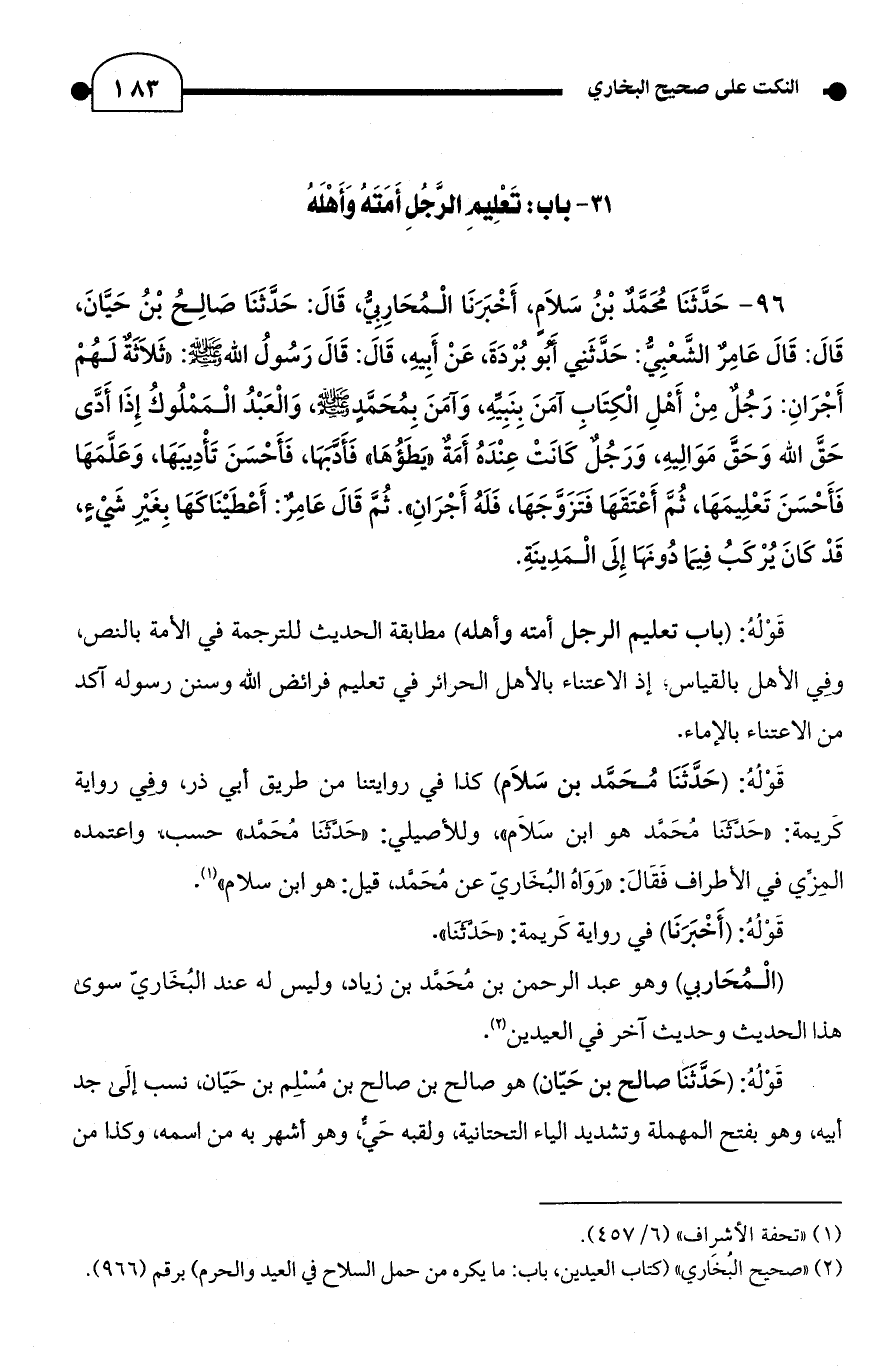 96 - حَدَّثَنَا مُحَمَّدٌ بْنُ سَلَامٍ، أَخْبَرَنَا الْمُحَارِبِيُّ، قَالَ: حَدَّثَنَا صَالِحُ بْنُ حَيَّانَ، قَالَ: قَالَ عَامِرٌ الشَّعْبِيُّ: حَدَّثَني أَبُو بُرْدَةَ، عَنْ أَبِيهِ، قَالَ: قَالَ رَسُولُ الله - صلى الله عليه وسلم -: "ثَلَاثَةٌ لَهُمْ أَجْرَانِ: رَجُلٌ مِنْ أَهْلِ الْكِتَابِ آمَنَ بِنَبِيِّهِ، وَآمَنَ بِمُحَمَّدٍ - صلى الله عليه وسلم -، وَالْعَبْدُ الْمَمْلُوكُ إِذَا أَدَّى حَقَّ الله وَحَقَّ مَوَالِيهِ، وَرَجُلٌ كَانَتْ عِنْدَهُ أَمَةٌ "يَطَؤُهَا" فَأَدَّبَهَا، فَأَحْسَنَ تَأْدِيبَهَا، وَعَلَّمَهَا فَأَحْسَنَ تَعْلِيمَهَا، ثُمَّ أَعْتَقَهَا فتزَوَّجَهَا، فَلَهُ أَجْرَانِ". ثُمَّ قَالَ عَامِرٌ: أَعْطَيْنَاكَهَا بِغَيْرِ شَيْءٍ، قَدْ كَانَ يُرْكَبُ فِيمَا دُونَهَا إِلَى الْمَدِينَةِ.