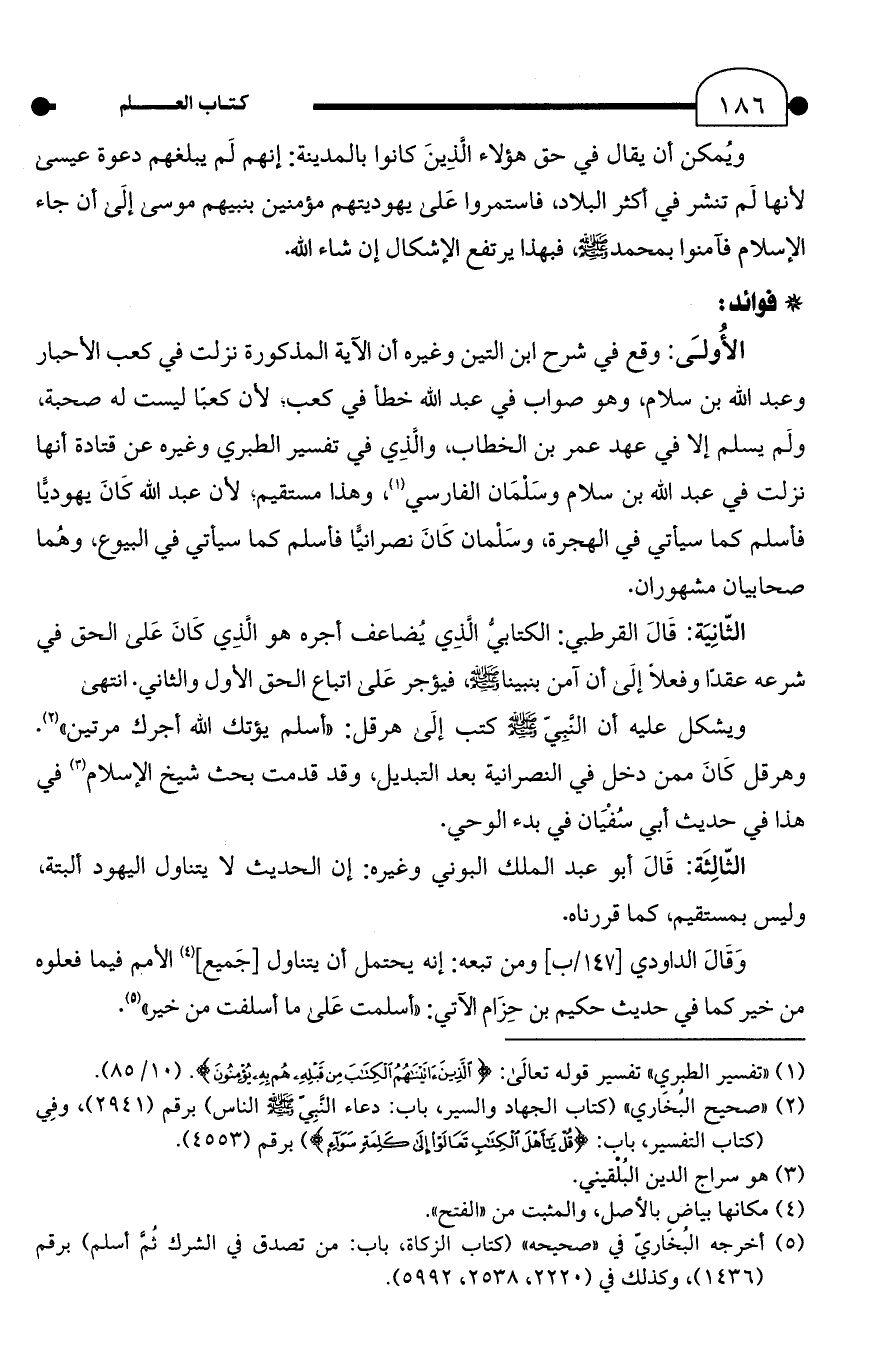 الأُولَى: وقع في شرح ابن التين وغيره أن الآية المذكورة نزلت في كعب الأحبار وعبد الله بن سلام، وهو صواب في عبد الله خطأ في كعب؛ لأن كعبًا ليست له صحبة، ولَم يسلم إلَّا في عهد عمر بن الخطاب، والَّذِي في تفسير الطبري وغيره عن قتادة أنها نزلت في عبد الله بن سلام وسَلْمَان الفارسي (¬1)، وهذا مستقيم؛ لأن عبد الله كَانَ يهوديًّا فأسلم كما سيأتي في الهجرة، وسَلْمان كَانَ نصرانيًا فأسلم كما سيأتي في البيوع، وهُما صحابيان مشهوران.